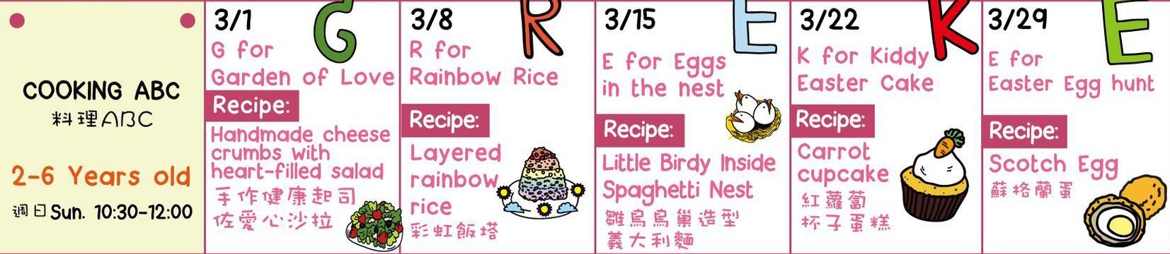 ・全程英語教學,以中文為輔助 ・學習語言、文化、算數、科學原理等知識 ・全方位學習生活技能,從小培養社交技巧 ・學習英語 26 個字母的型態、發音、拼字與簡單會話 ・一場探索世界的料理大冒險 ・五官與手作結合的歡樂體驗 ・吃進肚子裡的跟裝進腦子裡的一樣重要! ・每月更新課表!詳細課表請查閱商品介紹