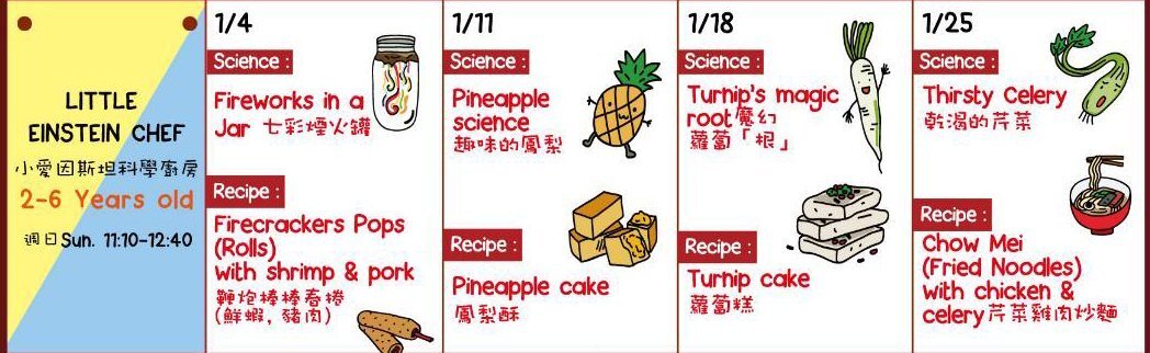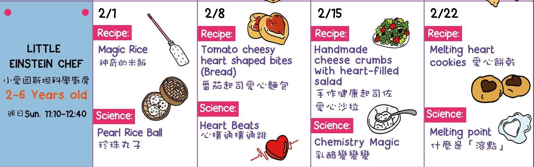 ・全程英語教學,以中文為輔助 ・學習語言、文化、算數、科學原理等知識 ・全方位學習生活技能,從小培養社交技巧 ・在烹煮食物的過程中,學習冷熱、軟硬、浮沈、三態…等等科學現象 ・一場探索世界的料理大冒險 ・五官與手作結合的歡樂體驗 ・吃進肚子裡的跟裝進腦子裡的一樣重要!