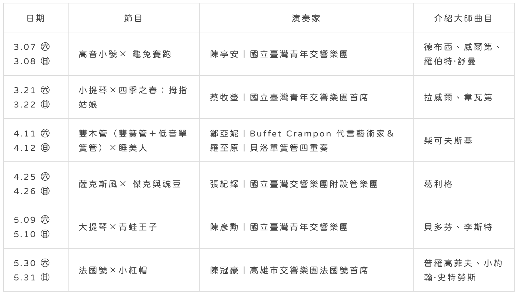 ・幼兒課程的小小職人體驗 ・幼兒的第一堂古典樂必修課:國內第一個能實際碰觸管弦樂器、與古典樂演奏家互動學習的幼兒音樂課 ・培育聽覺美感:給小寶貝視覺、聽覺、觸覺的全開體驗 ・開啟孩子的視野:交響樂團演奏家近距離教學以及兒童劇團演員說書 ・學會坐好之前,先學打開耳朵