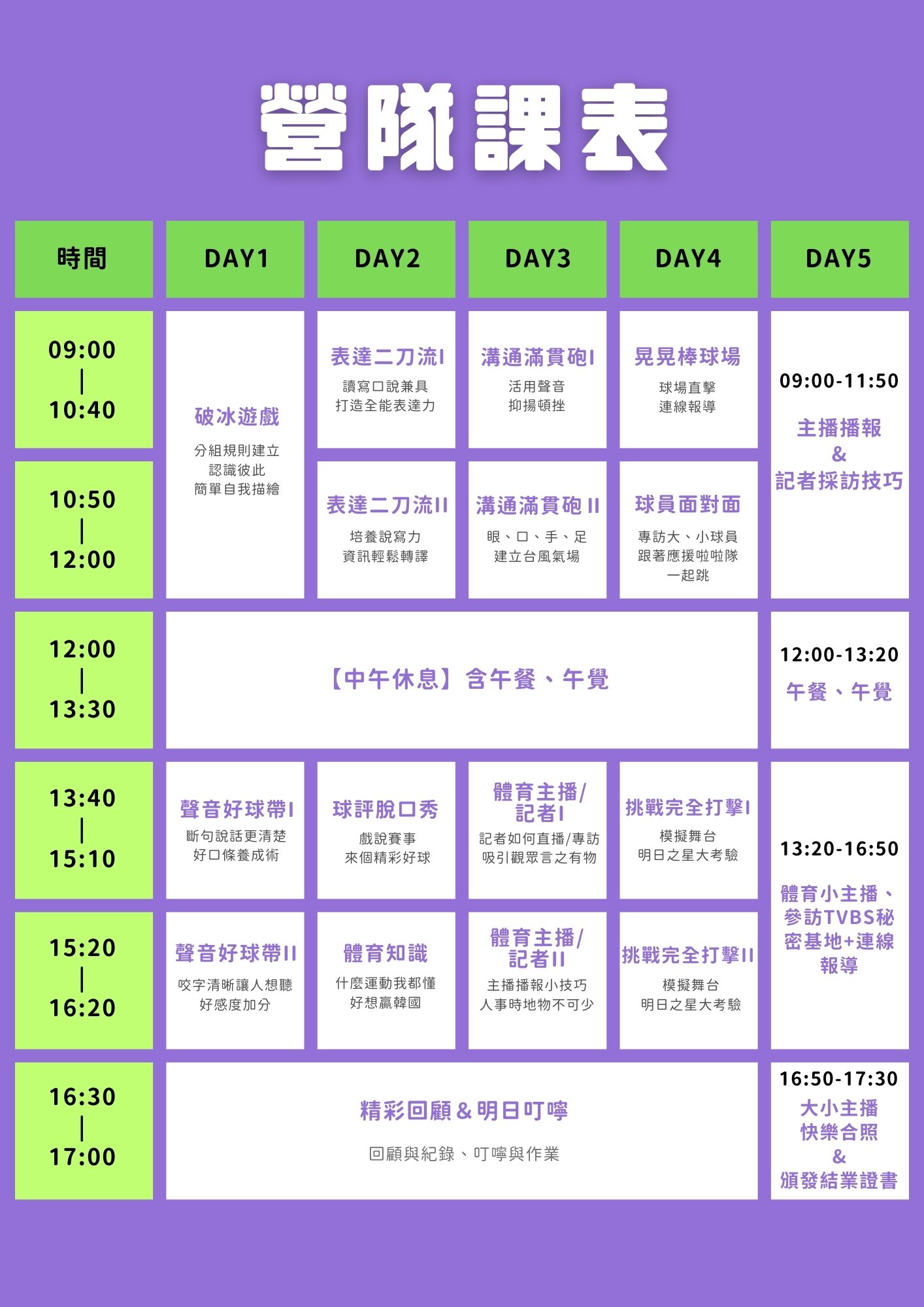・ 每梯次約 35 ~ 40 人,學員將依年級分組,一組約 7 ~ 8 人,每組 1 位隊輔 ・【 聲音變化球 】聲音真有趣,就像變化球忽高忽低,忽快忽慢,該如何停頓?如何加重音?完全由你來展現 ・【 表達二刀流 】讓孩子「說得清楚+說得好聽」,練習如何抓重點、聲音表情,講話表達更有節奏。知道什麼時候停、怎麼控制音量,開口更自然,也更有吸引力 ・【 溝通滿貫砲 】讓孩子「會說,也會互動」,不死背稿,重點講清楚就好,透過實際賽事教學,讓孩子學會怎麼開頭、怎麼講、怎麼收尾,更練習怎麼問問題、怎麼回答, 面對別人也能大方表達、不怕講錯 ・【 主播 Buzzer Beater 】克服上台恐懼、聆聽也讚美別人,課程引導孩子認識自己,面對緊張時也不畏懼,改善台下一條龍,台上一條蟲的問題,循序漸進的教學方式,讓孩子變得更有自信完成致勝關鍵一擊 ・【 球評 Talk Show 】資深球評教你怎麼看球、播報術語及播報好糗一羅籮筐的有趣故事 ・【 來去球場晃晃 】跟著主播一起體驗球場設備,登上投手坵、站上本壘板,同時跟球員面對面零距離溝通 ・【 挑戰完全打擊 】台風訓練、公眾表達,讓孩子體會勇敢比完美重要!讓孩子在公眾場合說話時能有穩健且不疾不徐的表現,從眼神到站姿,為孩子打造個人魅力 ・【 電視台模擬播報體育新聞 】主播親自指導、個人播報錄影紀錄實際參與主播級的培訓,勇敢坐上主播台;提供個人播報影片與活動相片等紀錄檔(需經後製剪輯,於課程結束後 3 週上傳到雲端,並提供特定連結,可下載留念)