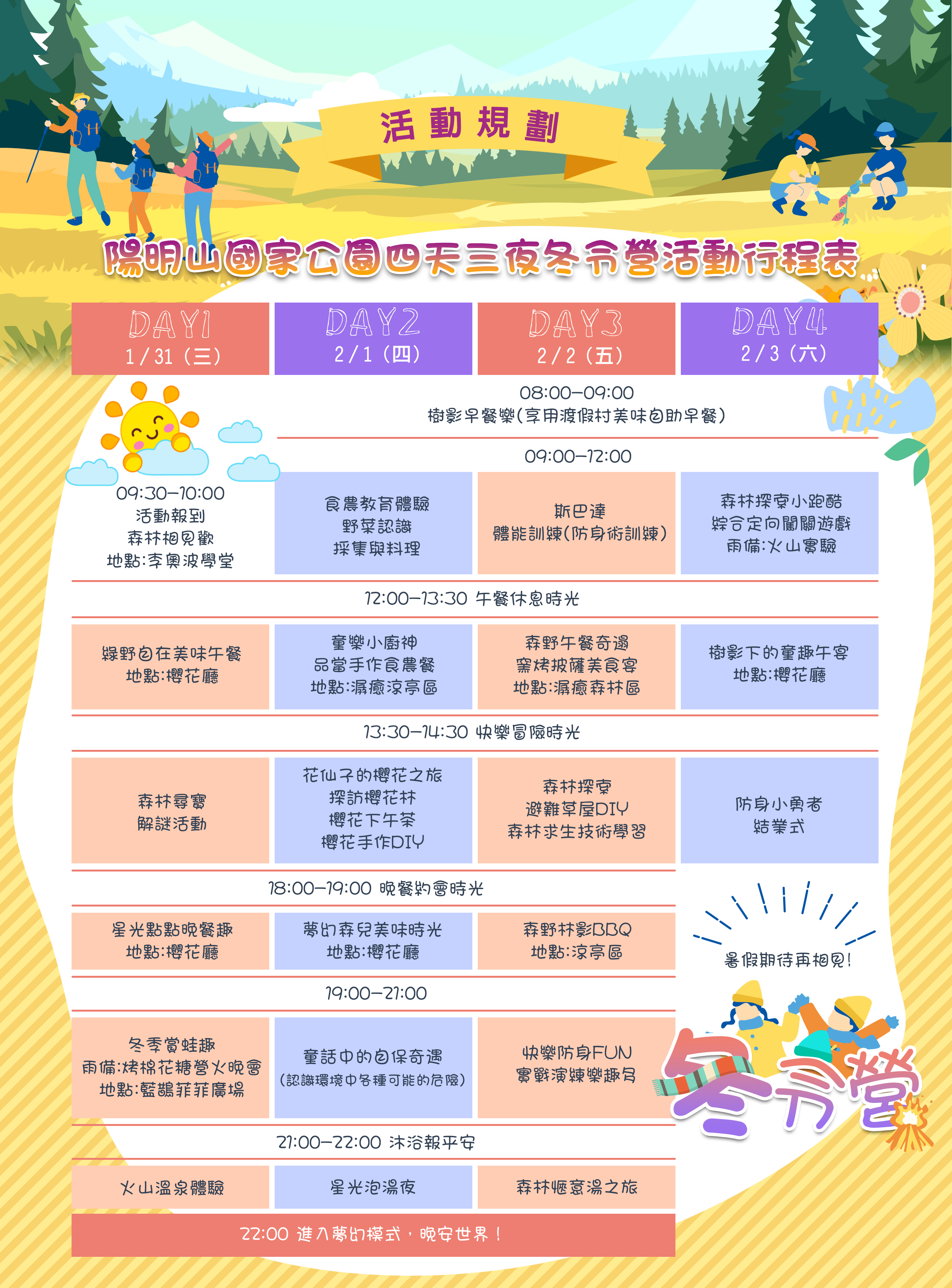 森林探索 ・學習森林求生、自我保護技巧:專業防身術教練親自指導兒童防身術 ・體驗都會近郊無法接觸的豐富夜間自然生態 ・避難草屋製作 美食 X 手作饗宴 ・美味餐食:陽明山菁艷餐廳專業廚師料理三餐 ・森林窯烤 Pizza :從產地到餐桌,從採集到料理都自己親自動手做 ・櫻花系列 DIY 手作產品一份 高級溫泉 ・每天都可以享受陽明山冷水坑的白磺泉,讓身心靈完全放鬆