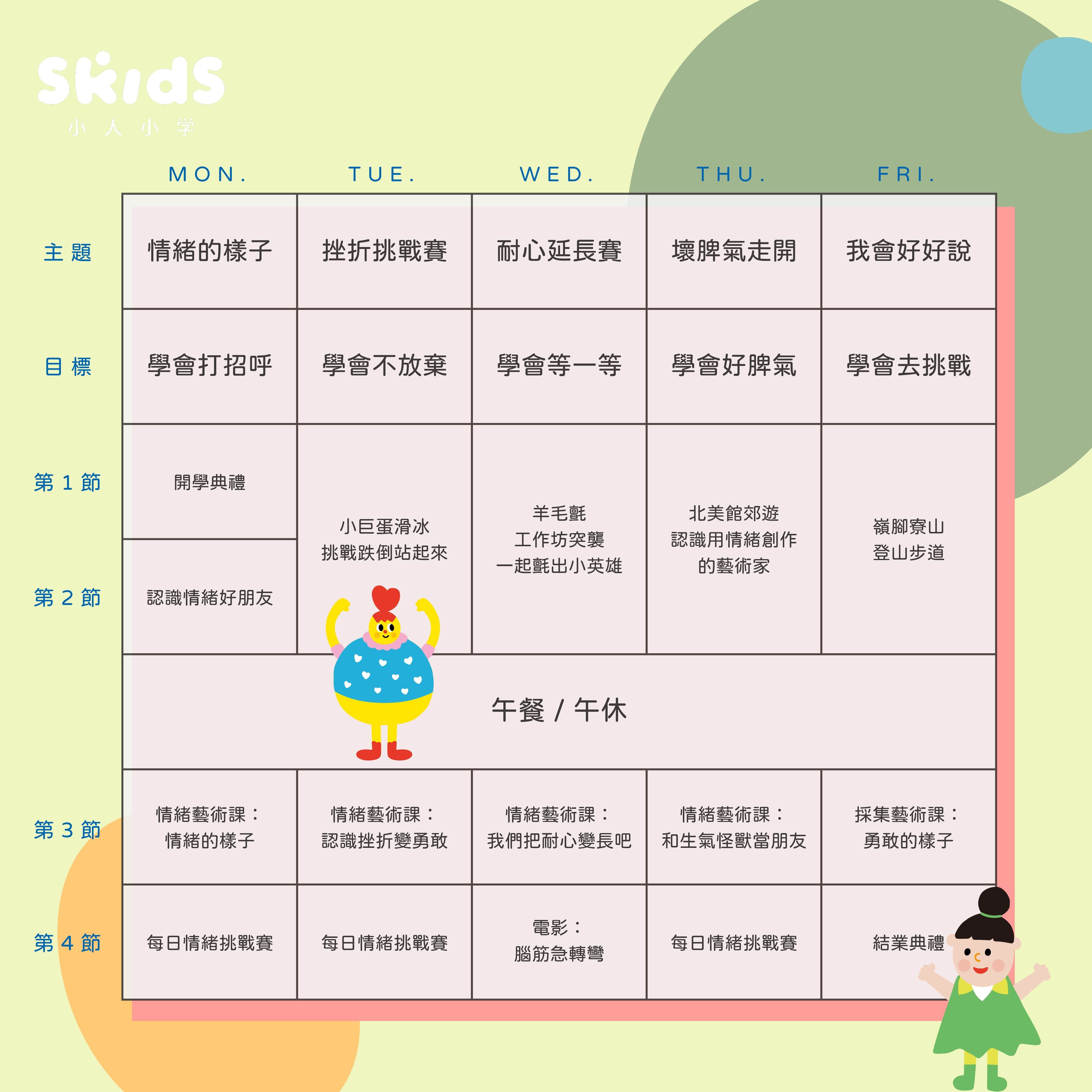 ● 挑戰舒適圈,練習打招呼,好好交朋友 ● 小巨蛋溜冰挑戰,練習跌倒後再爬起來! ● 羊毛氈製作體驗,訓練耐心與毅力的最好練習 ● 台北市立美術館參觀,挖掘自己安靜優雅的另一面 ● 與家人一起爬山,共同面對冒險與挑戰 (最後一天至少要有一位家人到場參與)