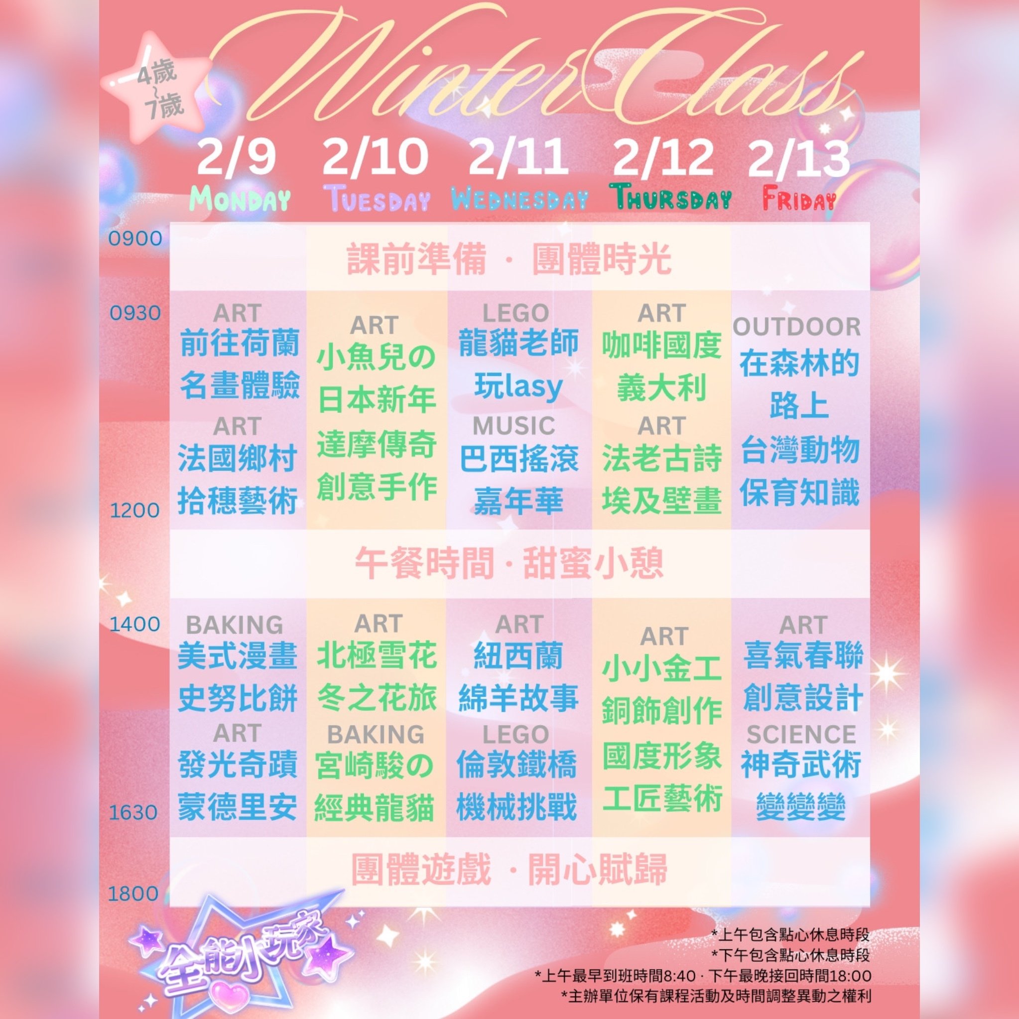 ・孩子們最愛的寶可夢、角落生物、卡通人物 plus 小小職人系列活動主題大大滿足 ・只要 5 天就可玩遍美術生態科學機械音樂烘焙等多元領域活動 ・動靜皆宜!有戶外有室內各種課程搭配,給孩子均衡全方位的探索發展 ・最專業的跨領域名師團隊聯合精心設計的各式卡通職人主題課程 ・小班制營隊師生比 1:5 給孩子舒適溫暖的關心陪伴 ・每個梯次都有各式不同的美術創作品或實驗操作小物等可以帶回家,跟家人分享滿滿喜悅成就感!