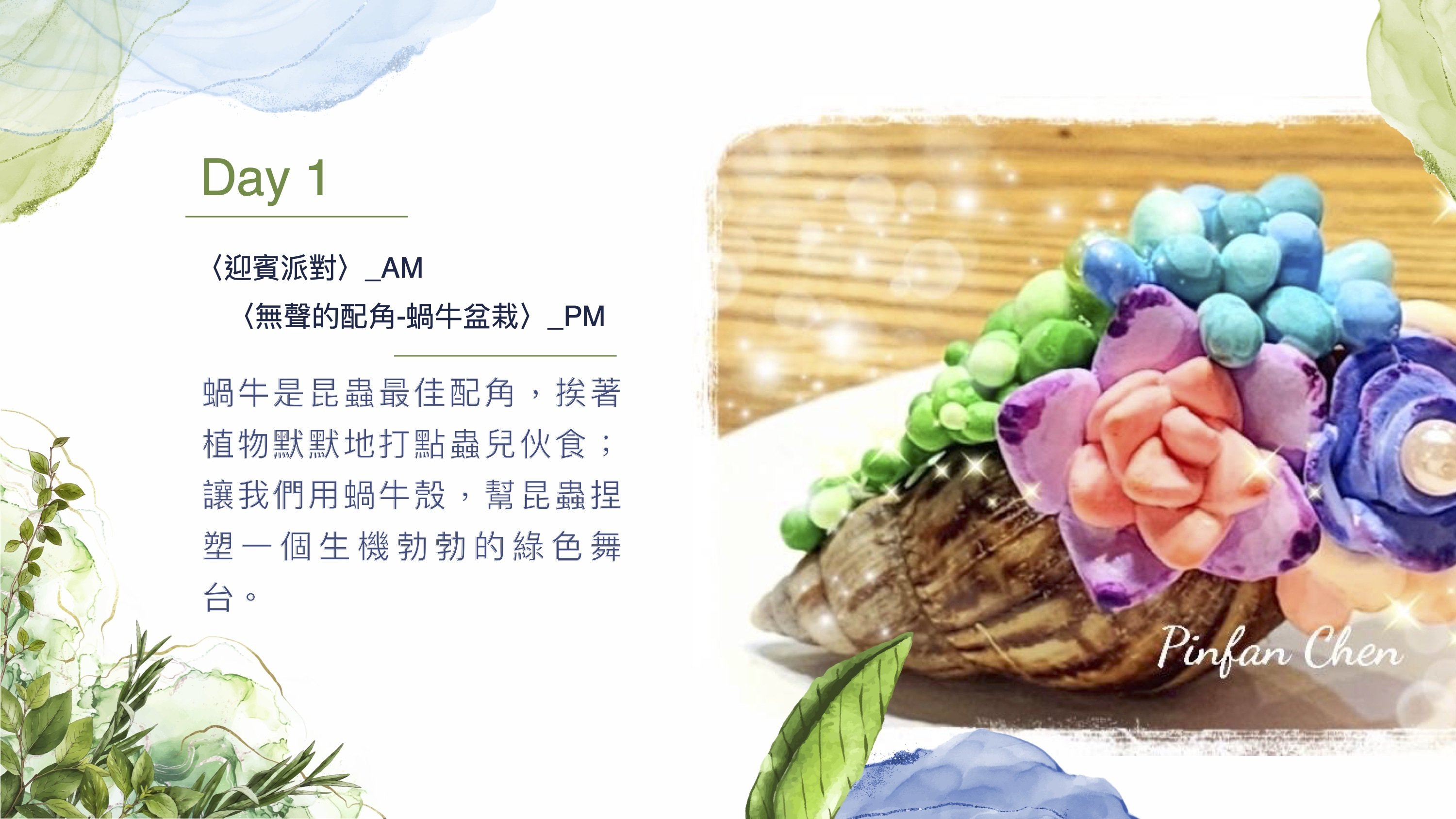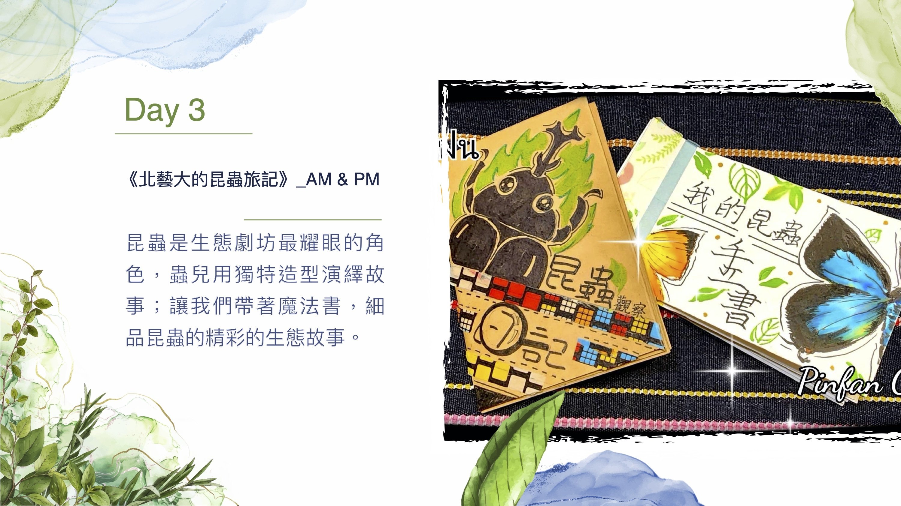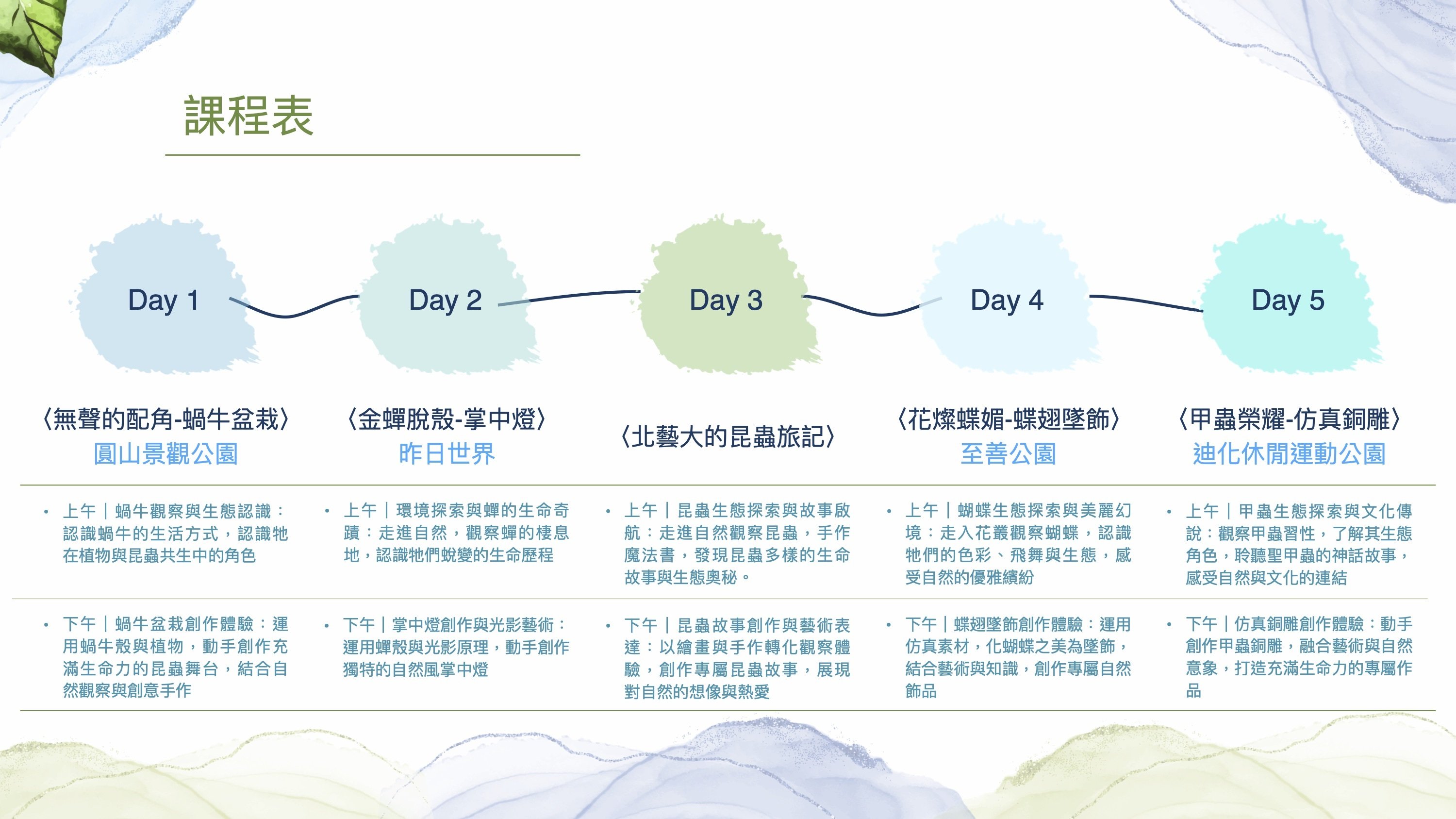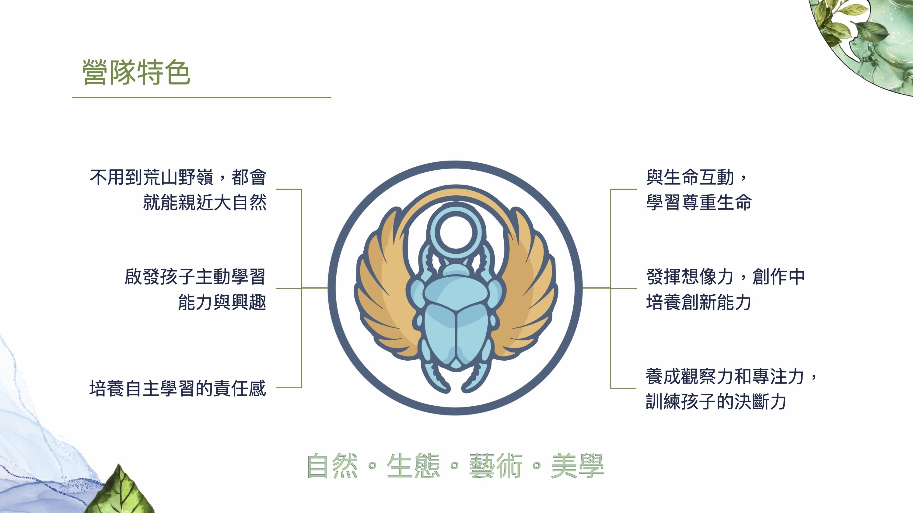 ・不用到荒山野嶺,都會就能親近大自然 ・親近生命,讓好奇啟發孩子主動學習的能力與興趣 ・與生命互動,學習尊重生命 ・培養孩子的覺察力和觀察力 ・發揮想像力,創作中培養創新與決斷能力 ・激發孩子感官,養成美的學習力 ・隨隊贈送專用昆蟲網及昆蟲觀察盒