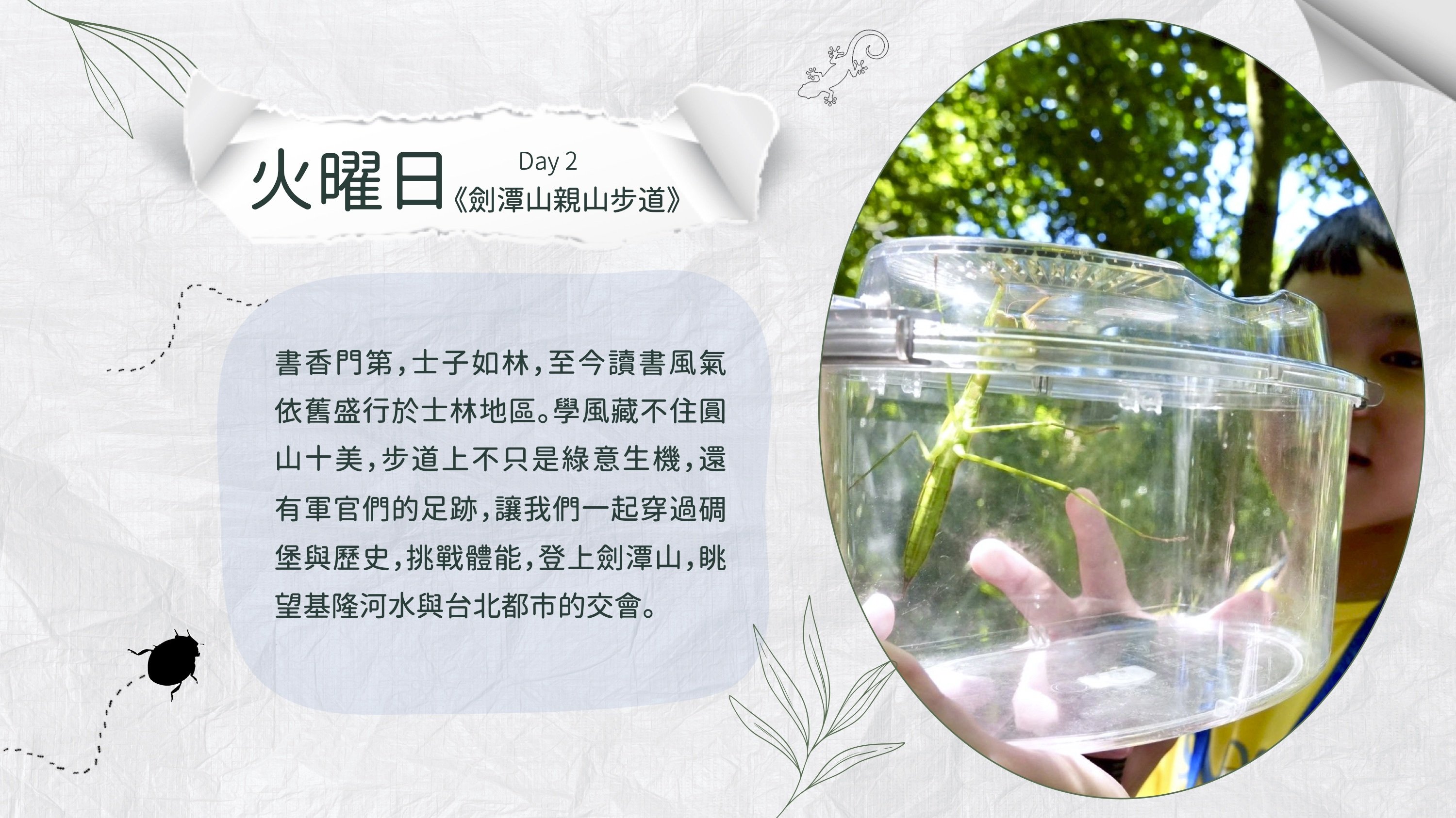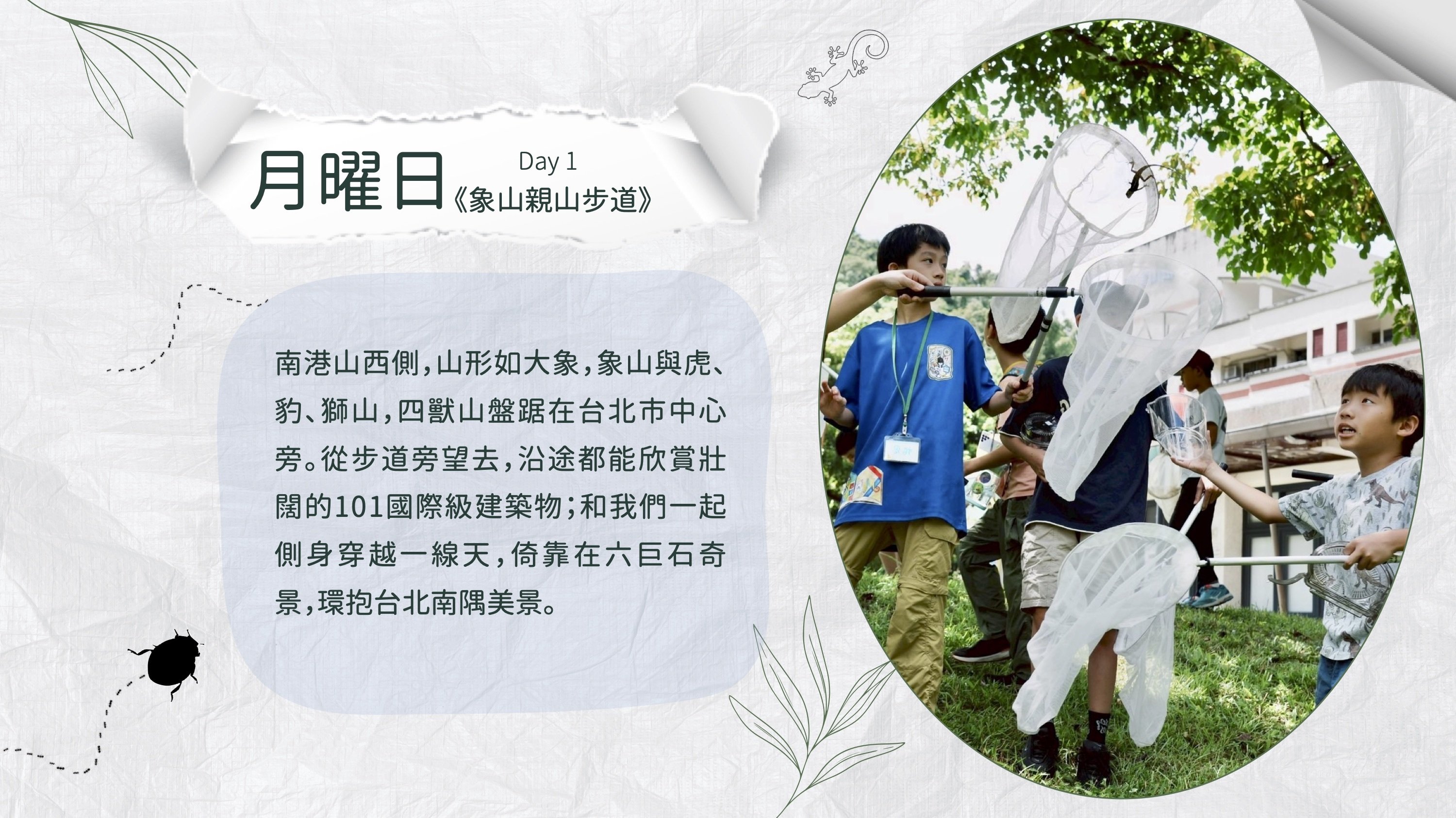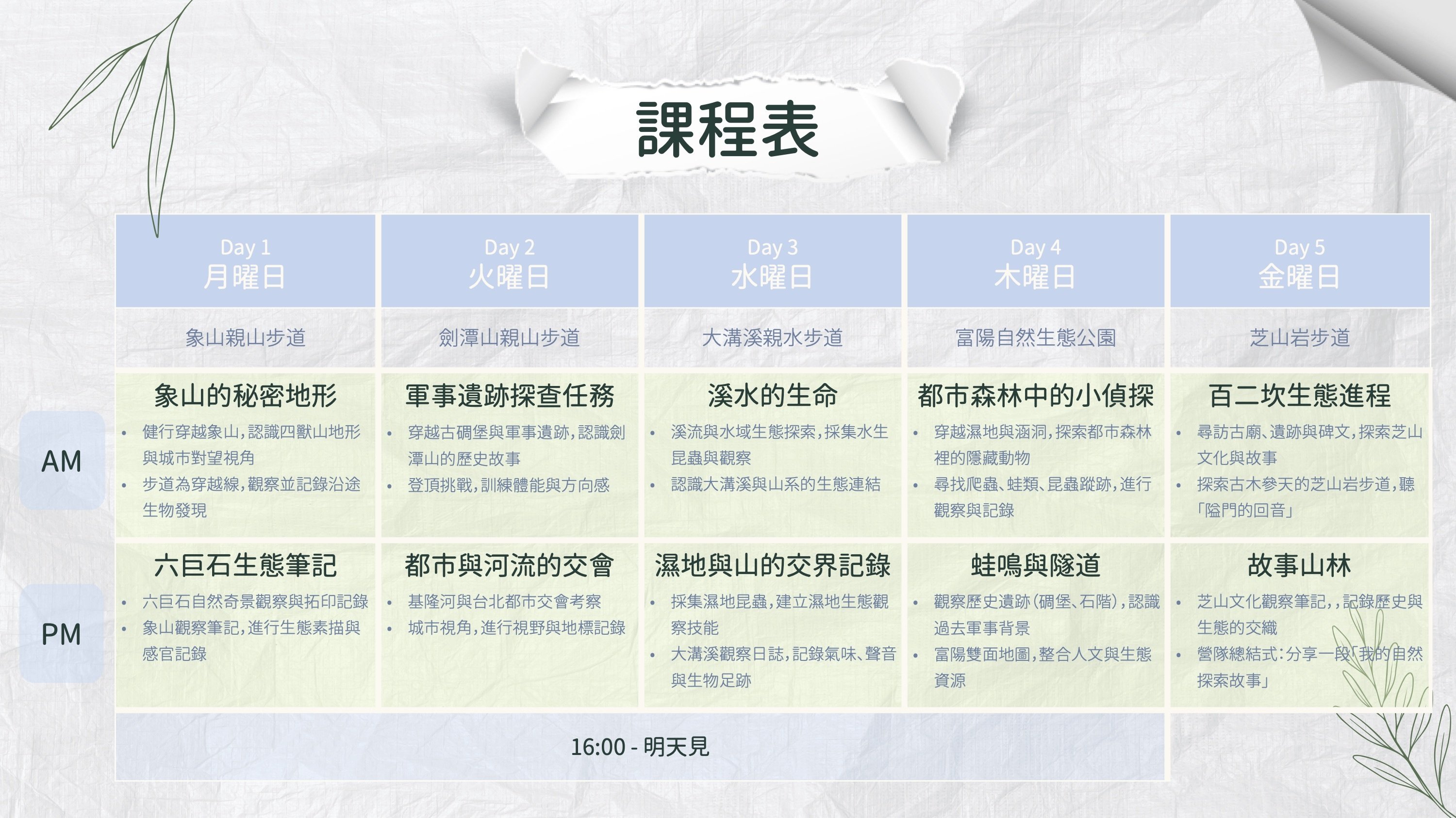 • 森林健走 × 體能鍛鍊:在專業老師帶領下,進行安全有趣的郊山健走,呼吸大自然的純淨空氣,提升孩子的心肺耐力與肢體協調,強健體魄又放鬆心情。 • 生命教育 × 尊重自然:親近自然、認識生命,從互動中學習尊重與珍惜每一個生命,培養孩子的同理心與環境意識。 • 採集體驗 × 生態探索:動手體驗採集昆蟲、觀察動植物,激發孩子對自然萬物的好奇心與探究力,發現生命的奧秘就在身邊。 • 生態紀錄 × 統計分析:透過觀察記錄、生物分類與簡單統計分析,訓練邏輯思考與科學觀察能力,讓學習不只好玩,更有深度。 • 智能發展 × 多面向學習:從觀察、動手到團隊互動,全方位啟發孩子的專注力、判斷力與問題解決能力,培養面對挑戰的自信與韌性。 • 情境學習 × 自主成長:營隊設計融入生活情境,引導孩子主動學習、樂於探索,培養責任感與團隊合作精神,讓學習變成一場快樂的冒險!