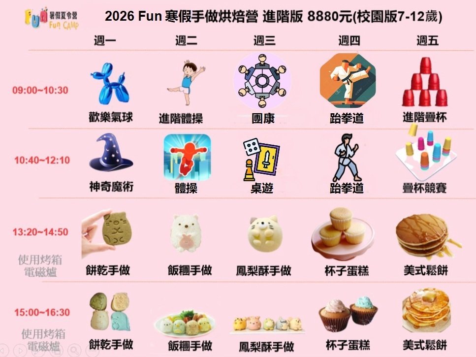 ・五日不過夜多元課程營隊 ・上午為運動類型專業課程,趣味動腦才藝課程 ・下午為主題手做烘焙課程手做餅乾、飯糰、杯子蛋糕 、鳳梨酥、美式鬆餅....等