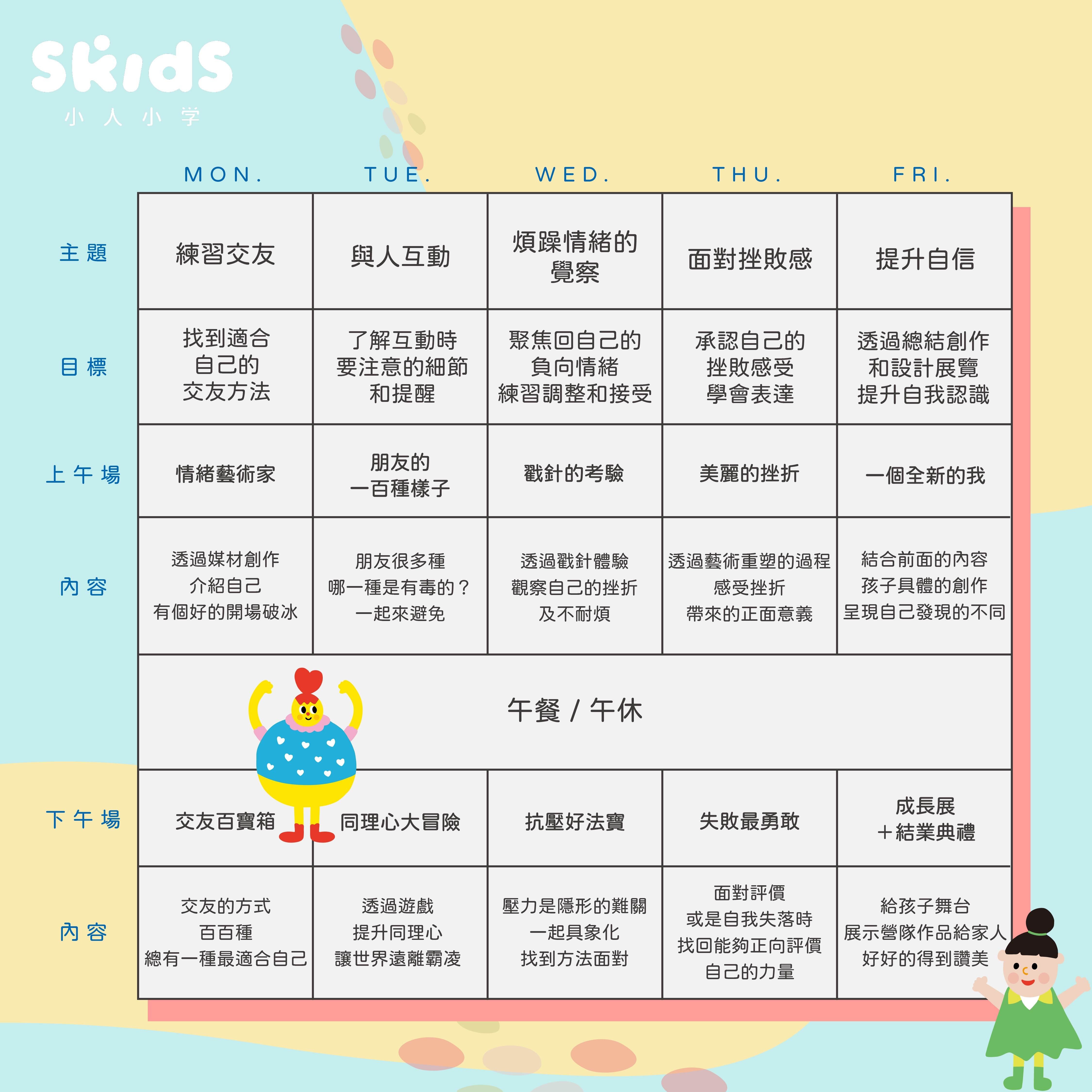 • 專業且有經驗的 SEL 師資團隊 • 特製且針對小學生生活情境的情緒教材 • 以創意思考和藝術創作為媒介帶領 • 透過混齡團體,讓思考和互動有更多碰撞 • 每天兩堂情緒藝術課,外加一次戶外放電時間 • 一個屬於自己舞台的結業典禮(希望家人參與)