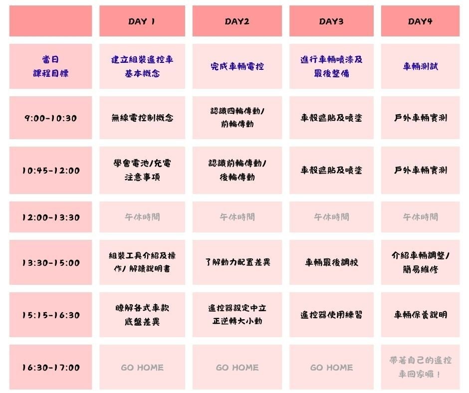・DAY 1: ※ 介紹無線電控制概念 Radio Control Concept(含車,飛機,船等動態遙控模型的基礎控制) ※ 說明各式 RC 車種的差異(v.s. 真實汽車的差異性) ※ 各類電池使用與充電注意項目 ※ 相關工具選擇與使用 ・DAY2:進行組裝 - 完成車輛底盤部分 ・DAY3:完成噴漆及最後整備部分 ・DAY4:上午實作戶外教學,並加強後續保養維修觀念