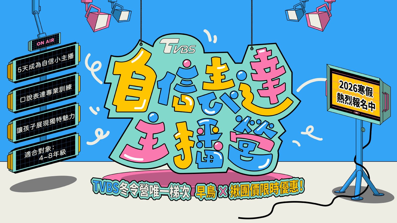 TVBS 自信表達主播營歷年來深獲家長口碑好評推薦,除了讓孩子們體會新聞從業人員之工作內容之外,目的在幫助孩子克服公眾表達(上台演講、報告、團體討論等)的恐懼,並可因此提升自信表達能力,進而釋放孩子的潛力與個人特質,讓他們樂於溝通分享、言之有物,實際參與主播級培訓,給孩子站上檯面的競爭力!