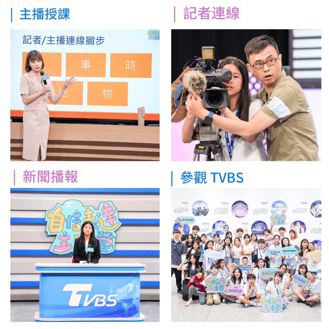 ・每梯次約 35 ~ 40 人,依年級分組,一組約 7 ~ 8 人,每組 1 位隊輔 ・【 自信心 】克服上台恐懼、肯定自己 ・【 口語表達力 】咬字口條、活用聲音表情、場景式演說訓練 ・【 邏輯思考力 】組織內容與表達架構、精簡資訊、短時間精確準備 ・【 大將之風與主播魅力 】主播儀態養成、演說台風指導、公眾表達訓練 ・【 電視台模擬播報 】主播與記者授課、播報錄影、採訪連線、攝影體驗、參觀 TVBS