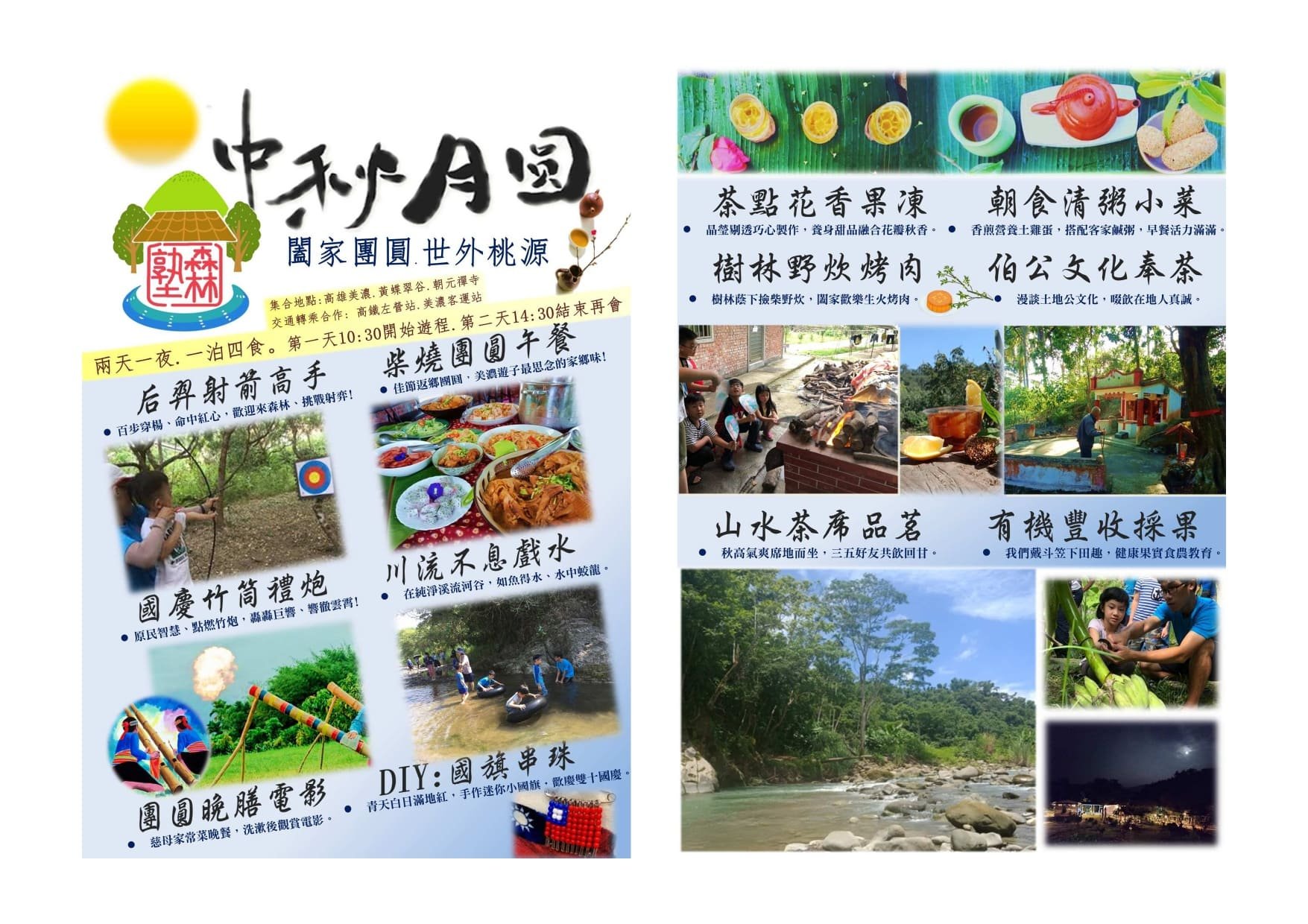 ・后羿射箭:提高寶貝們靜心、沉著並培養專注力 ・國慶竹筒禮炮:原民智慧、點燃竹炮,轟轟巨響、響徹雲霄 ・川流不息戲水:在純淨溪流河谷,如魚得水、水中蛟龍 ・柴燒團圓午餐、茶點花香果凍、朝食清粥小菜、樹林野炊烤肉 ・山水茶席品茗、伯公文化奉茶、有機豐收採果 ・團圓晚膳電影、DIY 國旗串珠