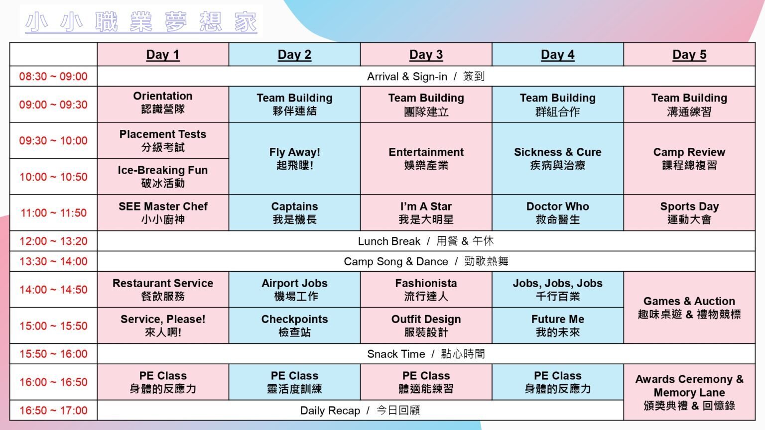 • 全英文情境演練:透過精心挑選的職業別(烹飪、飛機、流行和看診),實際練習和體驗所需的英文會話 • 與外籍老師和同伴們一起體驗夢想職業的酸甜苦樂! • 運動時間與運動會:透過肢體活動穩定孩子們的情緒,增進學習能力,以運動鍛鍊意志力與耐力 • 學以致用,透過營隊學習合作與獨立精神