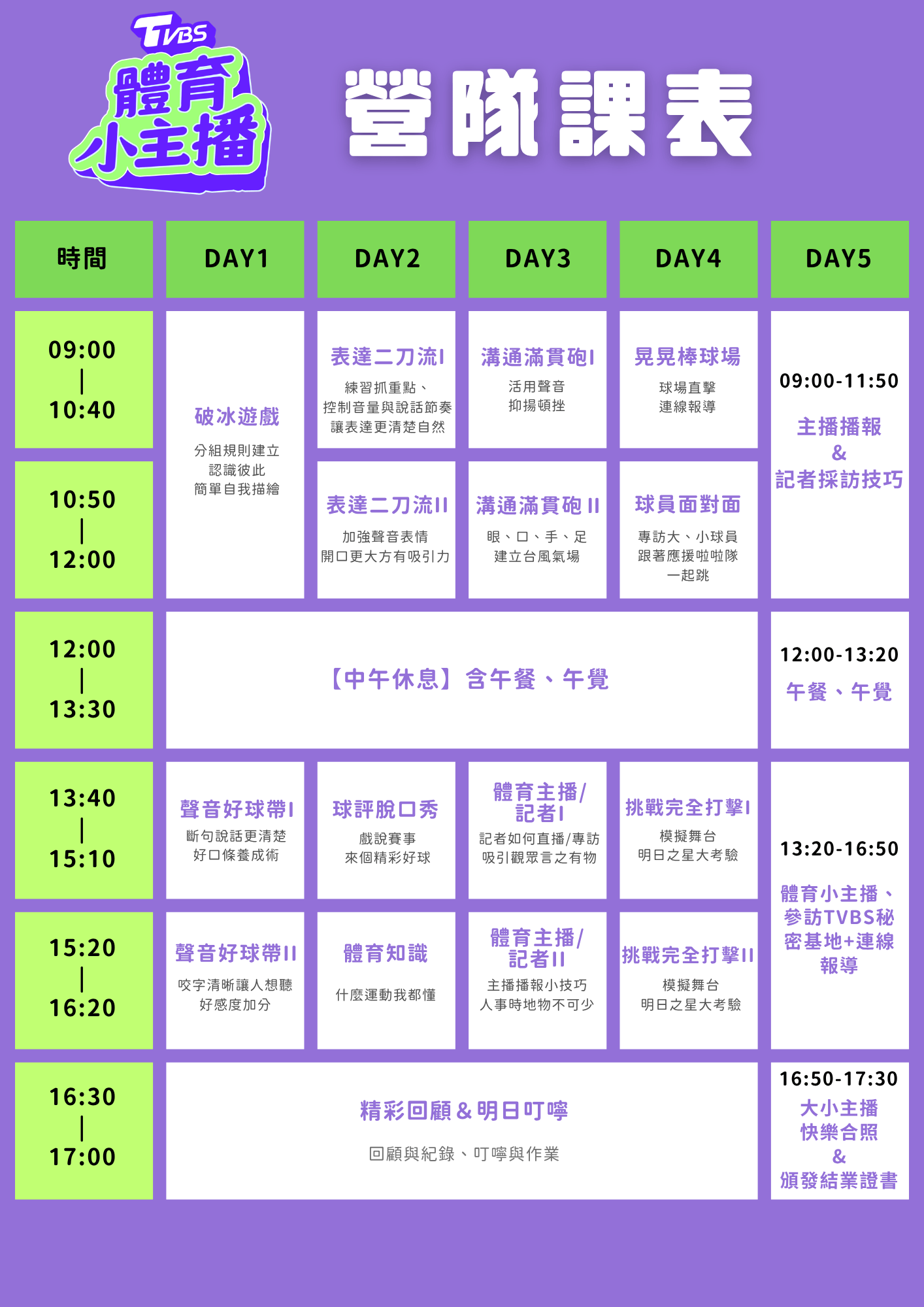 ・ 每梯次約 35 ~ 40 人,學員將依年級分組,一組約 7 ~ 8 人,每組 1 位隊輔 ・【 聲音變化球 】聲音真有趣,就像變化球忽高忽低,忽快忽慢,該如何停頓?如何加重音?完全由你來展現 ・【 表達二刀流 】讓孩子「說得清楚+說得好聽」,練習如何抓重點、聲音表情,講話表達更有節奏。知道什麼時候停、怎麼控制音量,開口更自然,也更有吸引力 ・【 溝通滿貫砲 】讓孩子「會說,也會互動」,不死背稿,重點講清楚就好,透過實際賽事教學,讓孩子學會怎麼開頭、怎麼講、怎麼收尾,更練習怎麼問問題、怎麼回答, 面對別人也能大方表達、不怕講錯 ・【 主播 Buzzer Beater 】克服上台恐懼、聆聽也讚美別人,課程引導孩子認識自己,面對緊張時也不畏懼,改善台下一條龍,台上一條蟲的問題,循序漸進的教學方式,讓孩子變得更有自信完成致勝關鍵一擊 ・【 球評 Talk Show 】資深球評教你怎麼看球、播報術語及播報好糗一羅籮筐的有趣故事 ・【 來去球場晃晃 】跟著主播一起體驗球場設備,登上投手坵、站上本壘板,同時跟球員面對面零距離溝通 ・【 挑戰完全打擊 】台風訓練、公眾表達,讓孩子體會勇敢比完美重要!讓孩子在公眾場合說話時能有穩健且不疾不徐的表現,從眼神到站姿,為孩子打造個人魅力 ・【 電視台模擬播報體育新聞 】主播親自指導、個人播報錄影紀錄實際參與主播級的培訓,勇敢坐上主播台;提供個人播報影片與活動相片等紀錄檔(需經後製剪輯,於課程結束後 3 週上傳到雲端,並提供特定連結,可下載留念)
