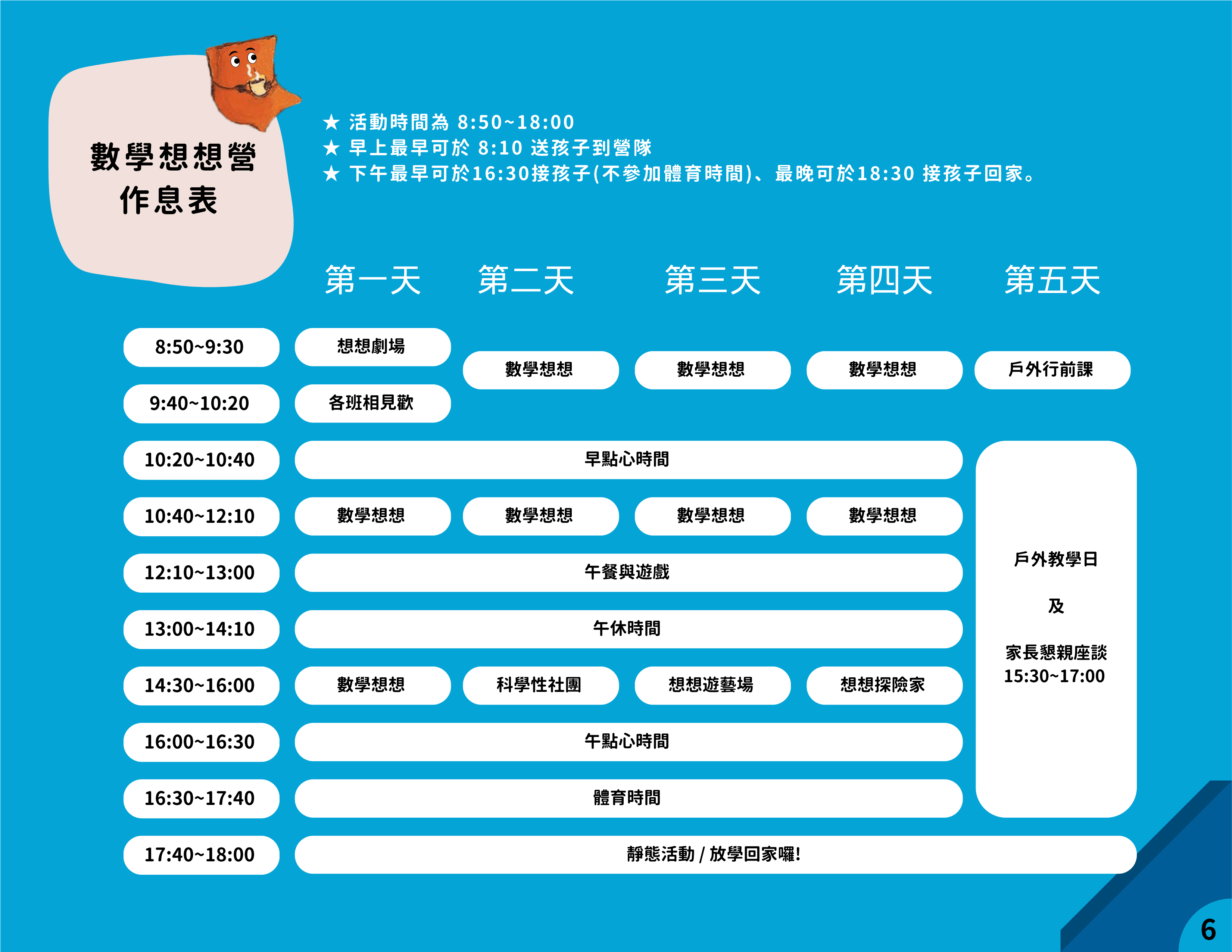 - 營隊時間:每日 8:50 ~ 18:00,早上最早可於 8:10 送孩子到營隊,下午最早可於 16:30 接孩子(不參加體育時間)、最晚可於 18:30 接孩子回家。