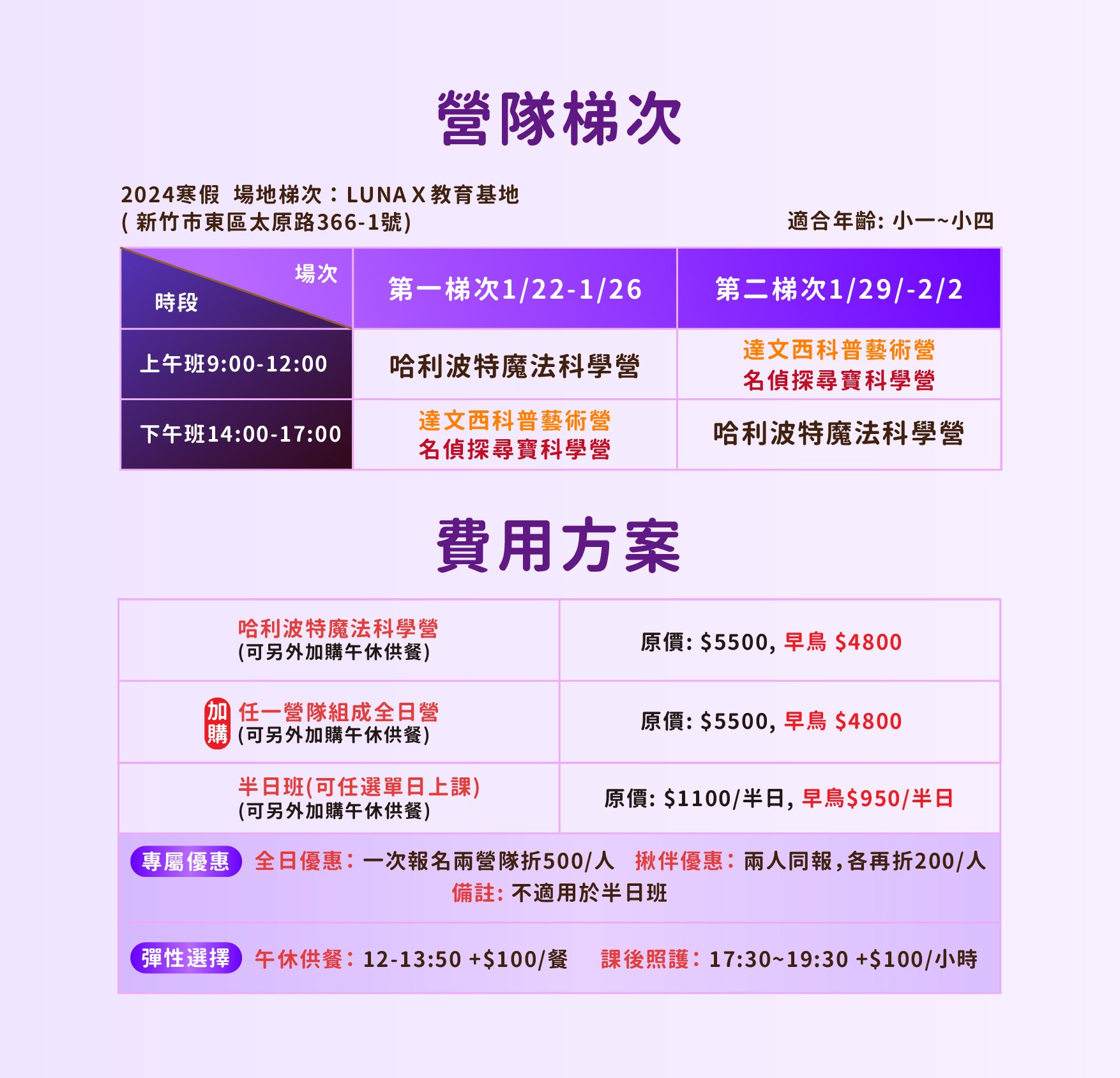 - 【全日優惠】適用於 同一位學員 報名使用,可選擇「哈利波特魔法科學營」任一梯次,搭配「達文西科普藝術營」、「穿越動漫探索日本文化營」、「名偵探尋寶科學營」任一梯次,無須為相同梯次