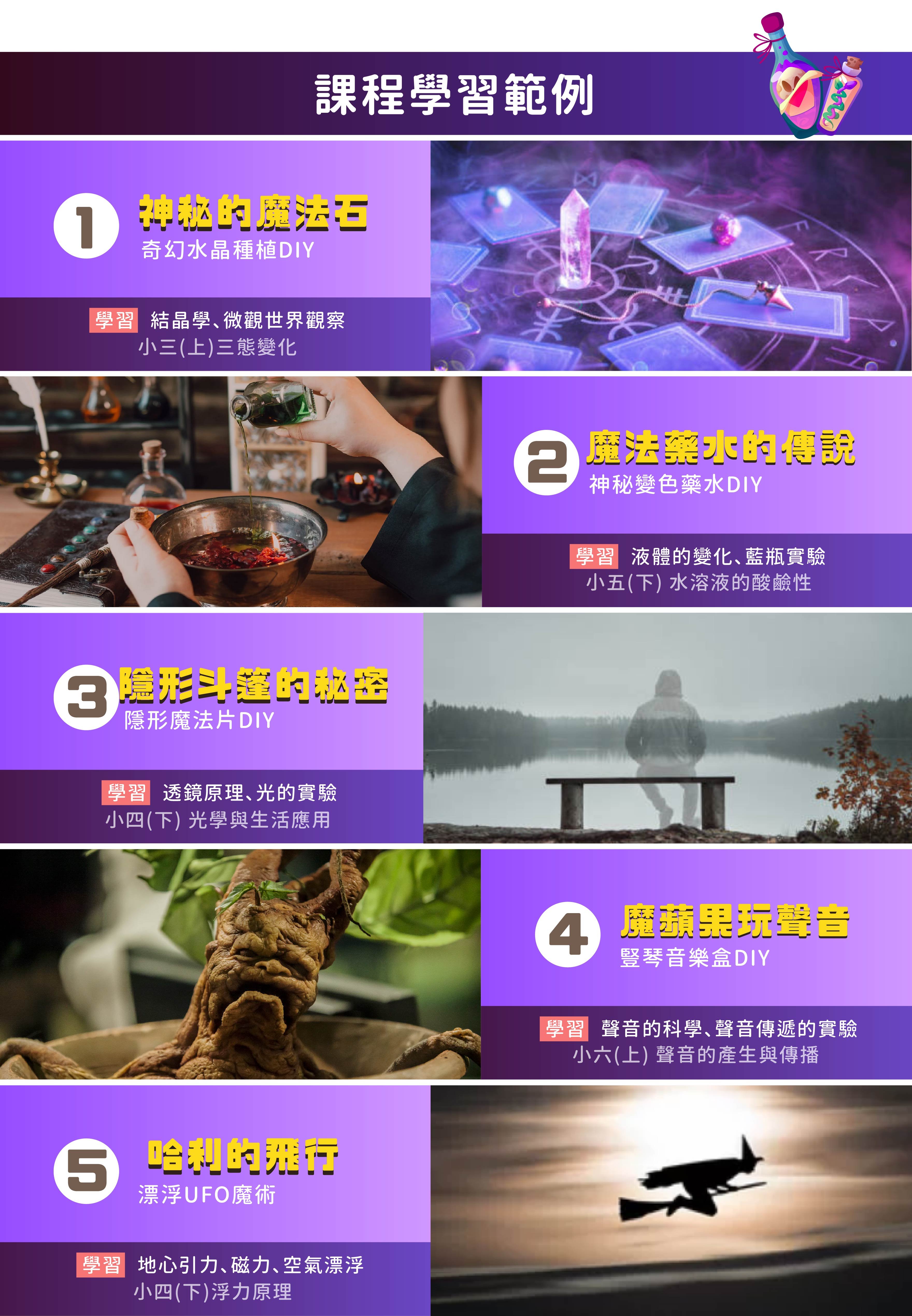 ・結合台灣小學課綱+美國STEAM ・學習用科學原理揭開魔法世界的奧秘! ・根據腦科學有效學習原理,設計內容起發動機 ・每個知識點搭配實作應用,培養帶得走的能力 ・模擬真實專案小組,面對挑戰強調團隊合作與恆毅力 ・北市明星小學合作師資,多元學經歷提升孩子視野高度 ・每日皆可帶回個人作品