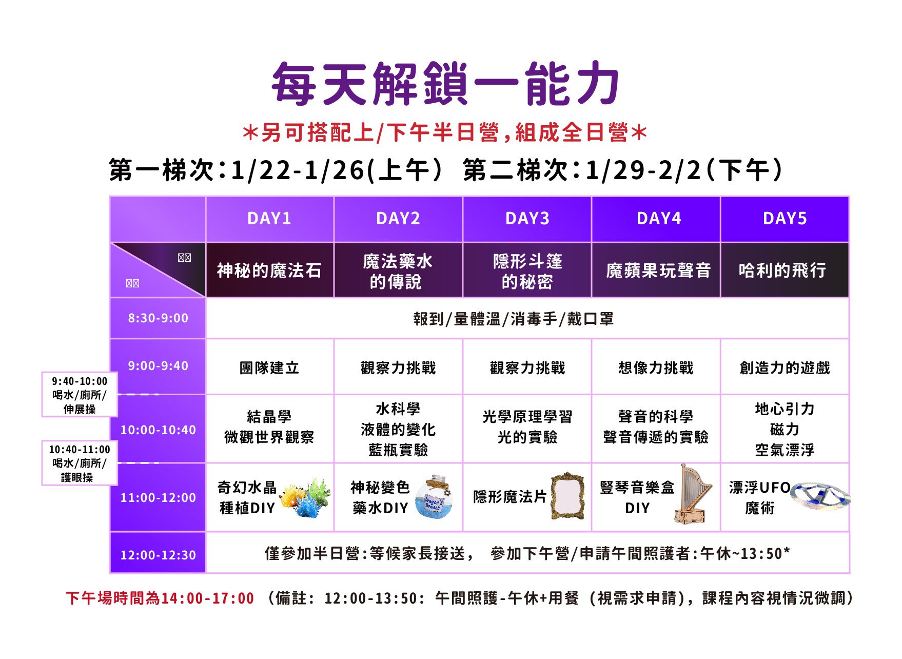 每日8:50集合,12:00結束;12:00 - 12:30 緩衝不收費,12:30 - 13:30 接回,酌收延托費$100 - 活動對象:大班 至 小學四年級