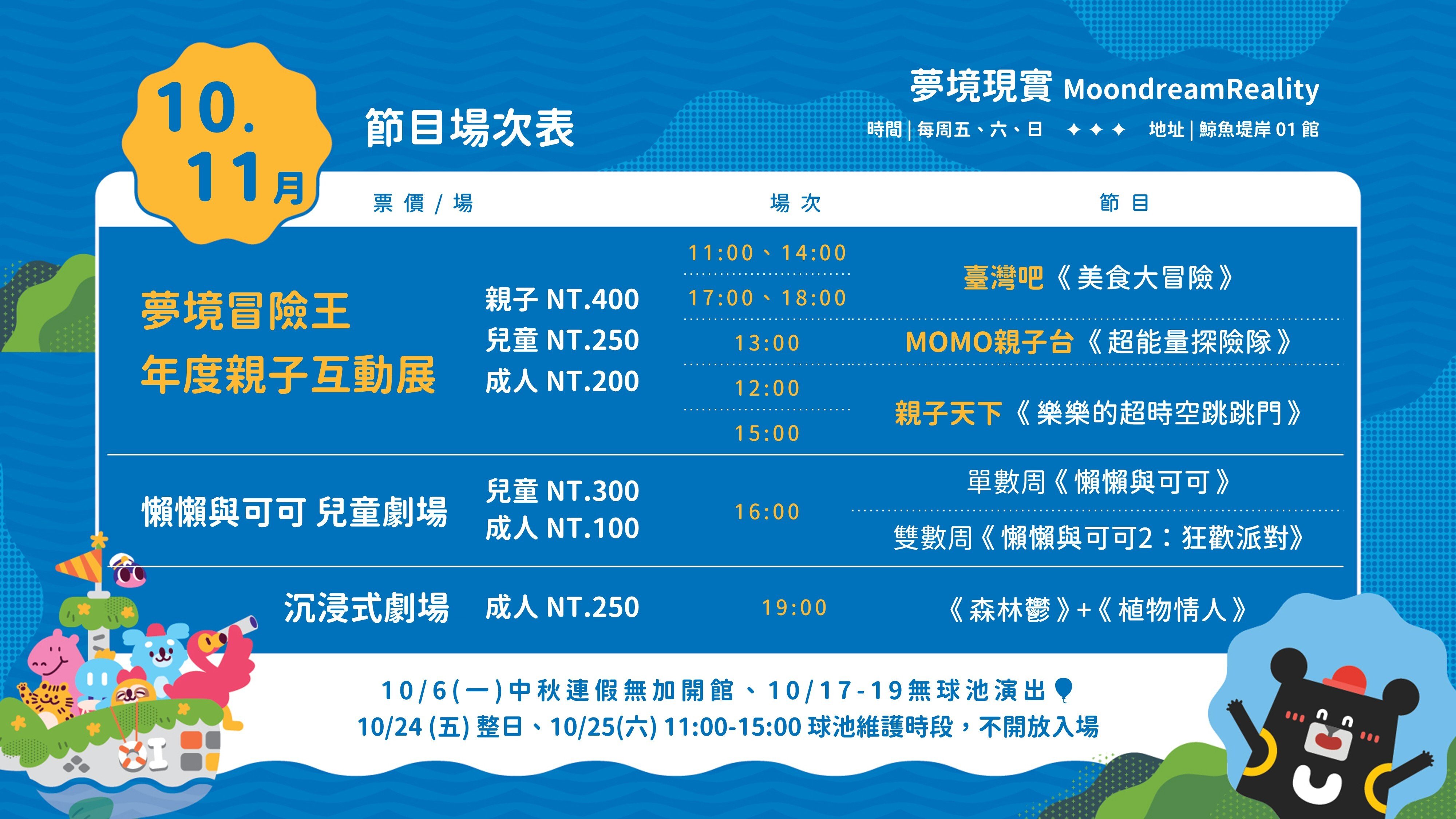 * 九 ~ 十一月主題場次時段不同,下訂前請注意主題、對應場次時間 * 【球池暫停演出】9/19 ~ 9/21、10/17 ~ 10/19 球池清洗維護周,演出照常但暫無球池體驗 • 欣賞內容:《夢境冒險王》 MOMO 親子台 x 親子天下 x 臺灣吧 聯合製作 兒童劇場 • 體驗單一場次:《 MOMO 親子台》或《親子天下》或《臺灣吧》(三主題擇一) • 片長:40 分鐘/體驗長度:50 ~ 60 分鐘 • 沉浸式空間:環繞式牆面與地面投影,提供孩童多元學習空間 • 建議體驗年齡:2 ~ 10 歲,全程需成人陪同。未滿一歲(含)免門票 【九月場次】 9月場次時段 兩大主題場次不同,請留意時段選擇! 活動期間: 9/1 ~ 9/30(每週五、六、日) • 親子天下_樂樂的超時空跳跳門|場次時間:11:00、14:00、17:00、18:00 • MOMO 親子台_超能量探險隊|場次時間:12:00、15:00 【十月 & 十一月場次】 10月、11月場次時段 三大主題場次不同,請留意時段選擇! 活動期間: 10/1 ~ 11/30(每週五、六、日) • 臺灣吧_美食大冒險|場次時間:11:00、14:00、17:00、18:00 • 親子天下_樂樂的超時空跳跳門|場次時間:12:00、15:00 • MOMO 親子台_超能量探險隊|場次時間:13:00