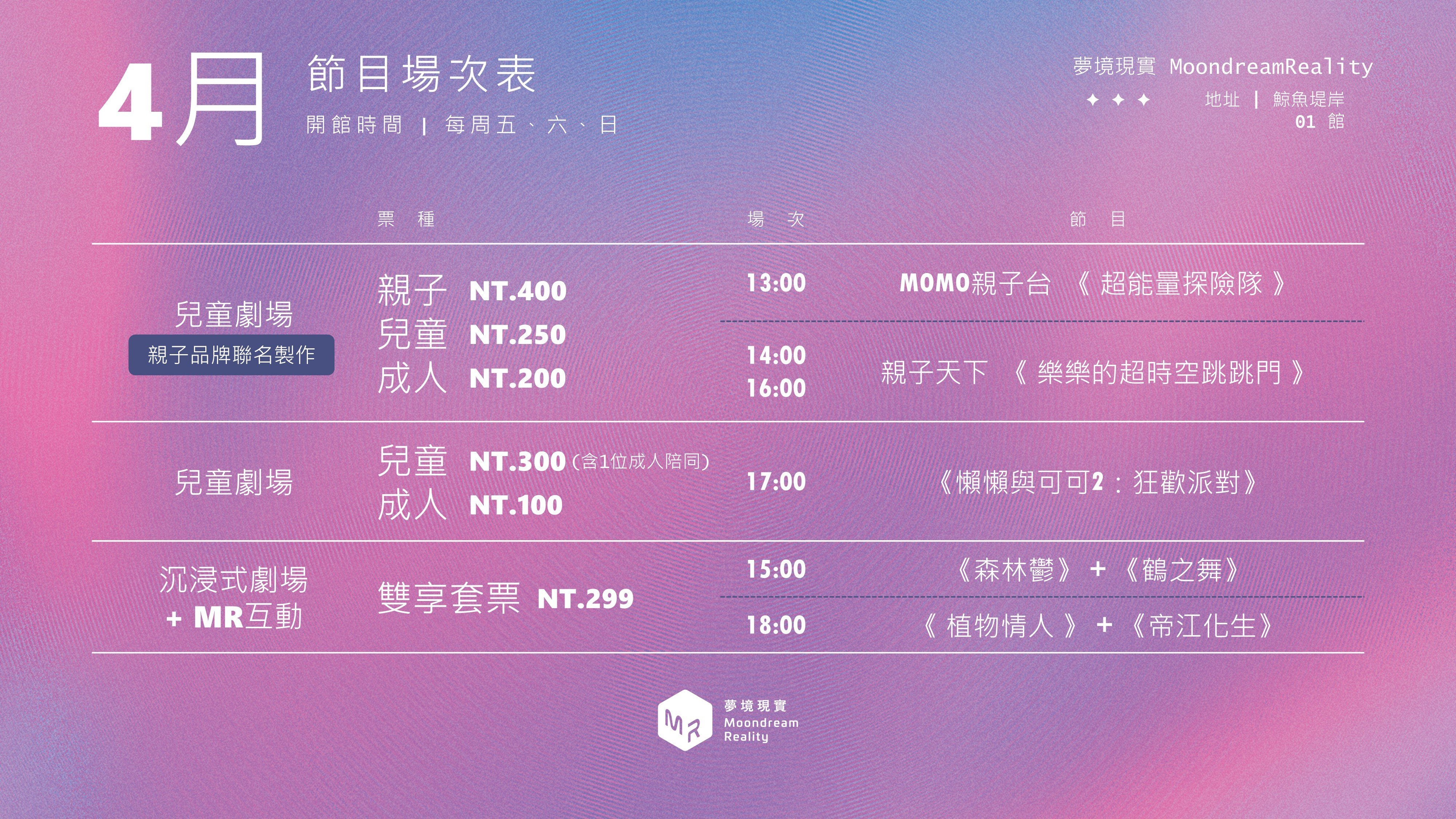 *本活動之球池設施僅開放至 2025 年底,2026 年起活動不含球池,請購票前確認內容 • 欣賞內容:《親子互動展》 MOMO 親子台 x 親子天下 聯合製作 兒童劇場 • 體驗單一場次:《 MOMO 親子台》或《親子天下》(主題擇一) • 片長:40 分鐘/體驗長度:50 ~ 60 分鐘 • 沉浸式空間:環繞式牆面與地面投影,提供孩童多元學習空間 • 建議體驗年齡:2 ~ 10 歲,全程需成人陪同。未滿一歲(含)免門票 【 最新場次 】 4 月場次時段:二大主題場次不同,請留意時段選擇! 活動期間: 4/1 ~ 4/30(每週五、六、日) 親子天下_樂樂的超時空跳跳門 場次時間: 14:00、16:00 MOMO親子台_超能量探險隊 場次時間:13:00 5 月場次時段:二大主題場次不同,請留意時段選擇! 活動期間: 5/1 ~ 5/31(每週五、六、日) 親子天下_樂樂的超時空跳跳門 場次時間: 14:00、16:00 MOMO親子台_超能量探險隊 場次時間:13:00