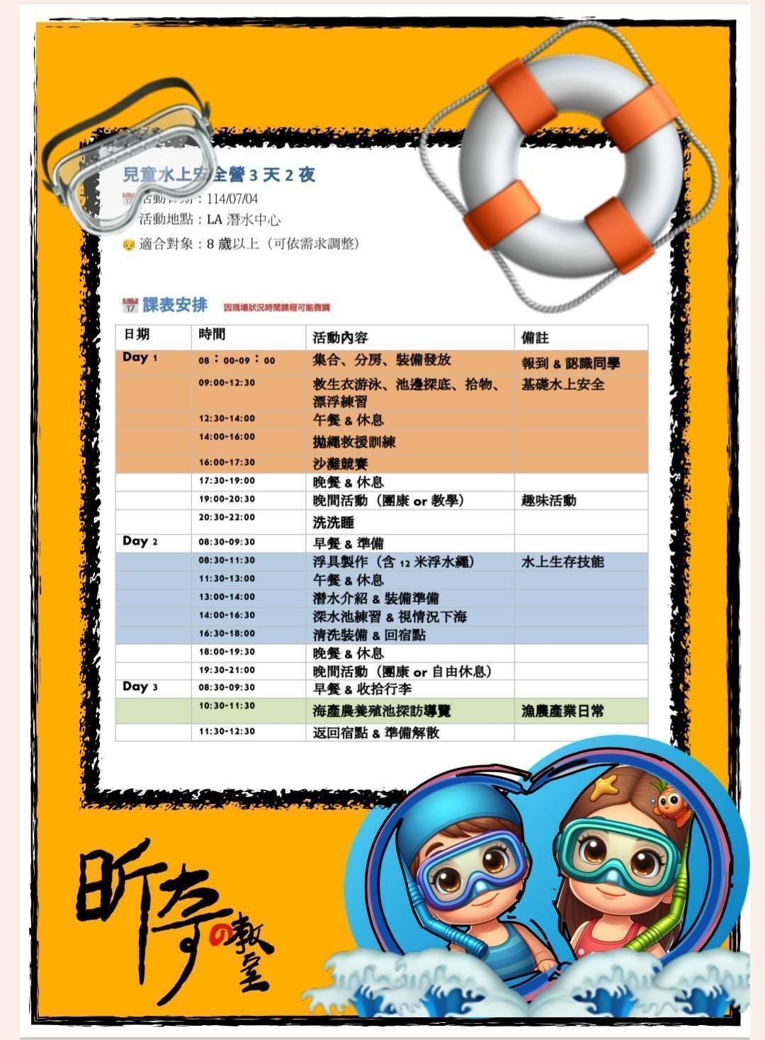 2. 裝備與服裝:參加者須自備泳裝、換洗衣物、防曬用品;營隊將提供救生衣與相關安全設備