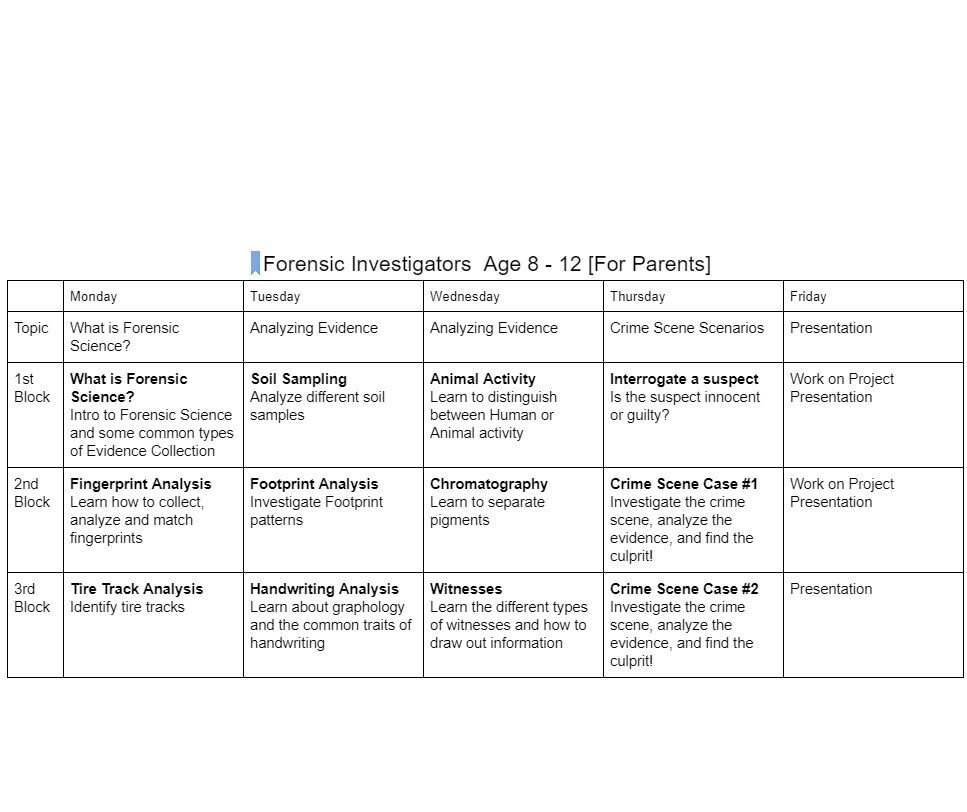 • 提供專業知識:引導孩子們了解證據分析、犯罪場景調查和鑑識技術等專業領域的基礎,了解法醫學、犯罪學和鑑識科學的基本知識,並認識犯罪現場的搜證和分析方法。