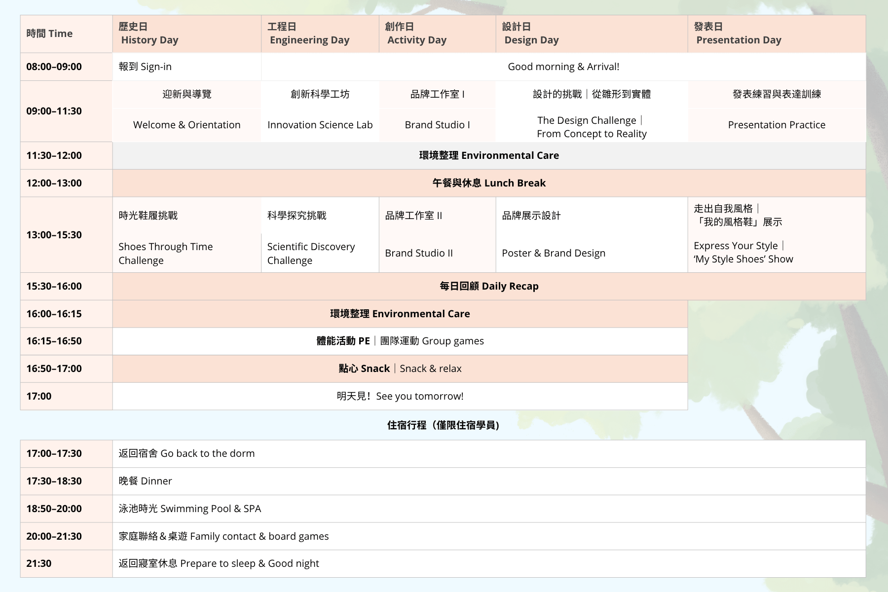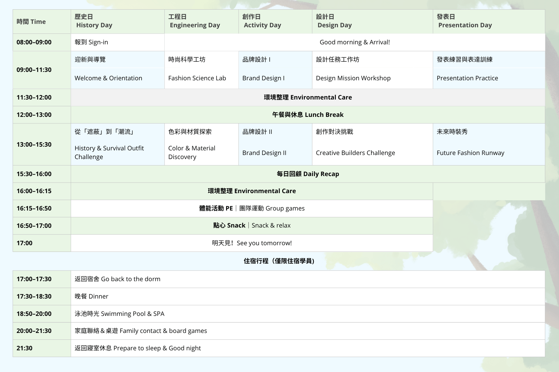 • 營隊總長:五天四夜過夜營隊,報名時僅需選擇營隊的第一天日期,即包含完整五天過夜營隊