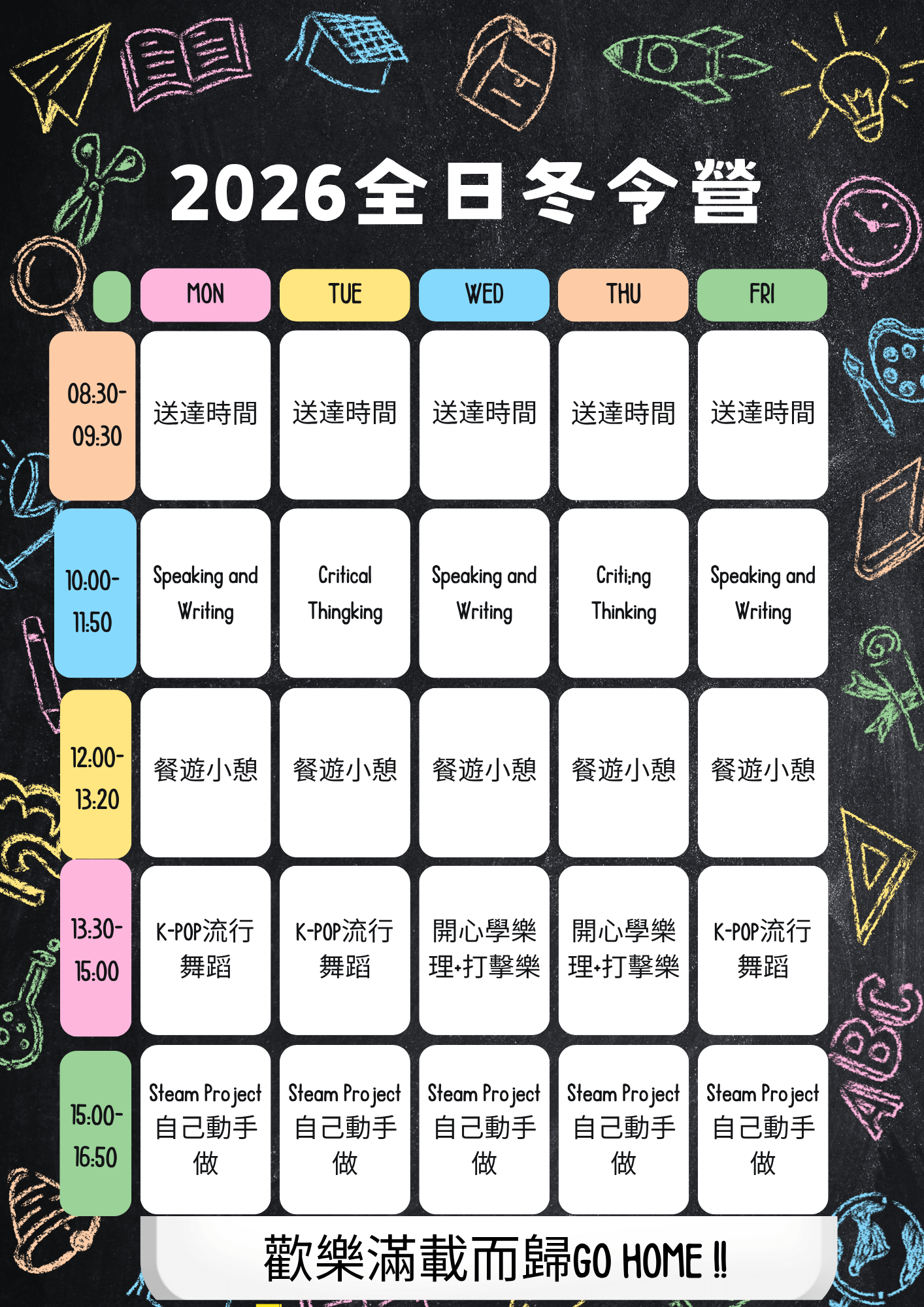 • 英語作文提升,奠定聽說讀寫四大能力 • 主題式 STEAM 藝術探索 • K-POP 流行舞蹈和音樂課程 • 滿滿的豐富多元化課程還有搭配驚喜活動,讓孩子的寒假既好玩又充實