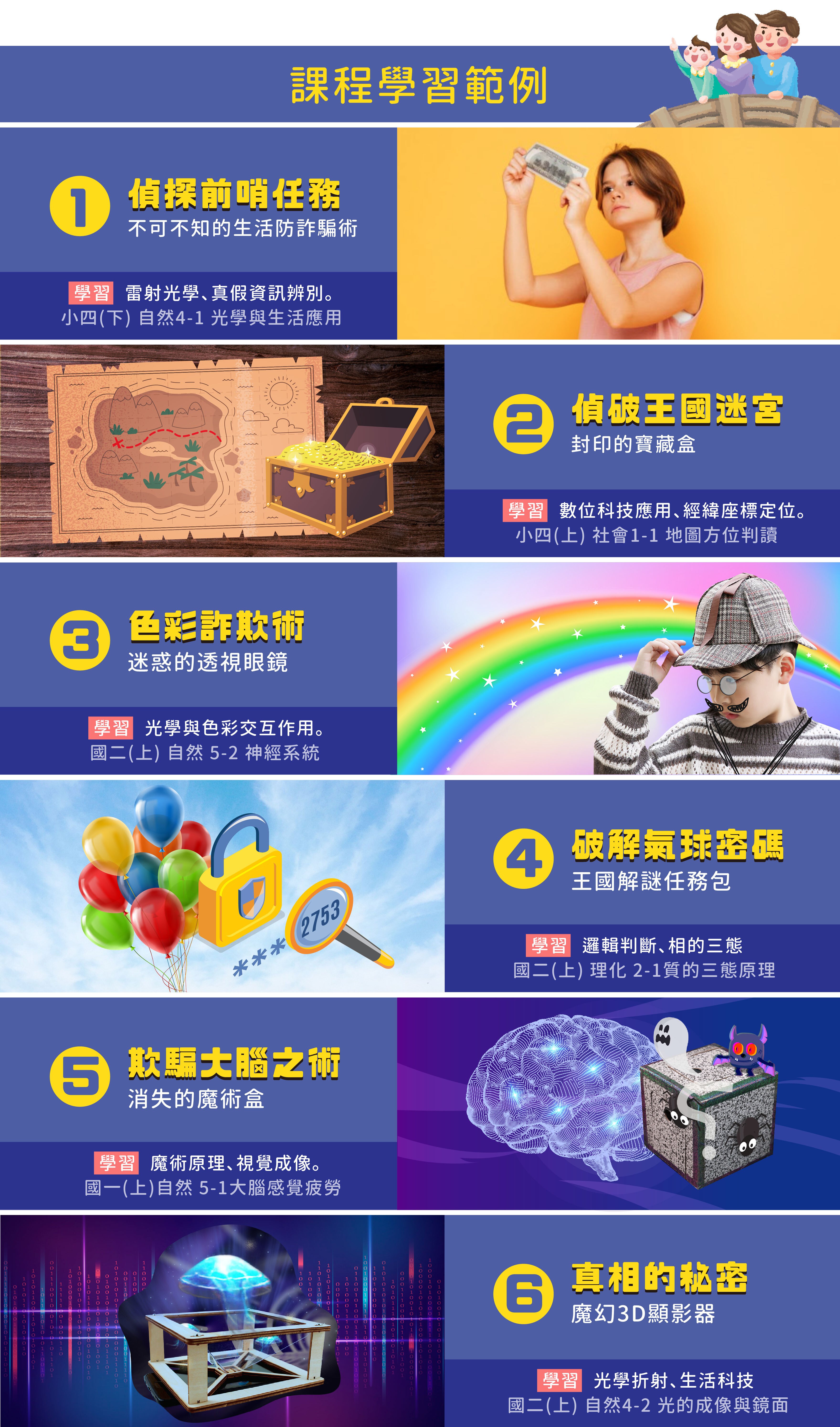 ・8 大實作任務+5 大科普懸案+1 大寶藏 ・1日古蹟尋寶解謎體驗 ・根據腦科學有效學習原理,設計內容起發動機 ・每個知識點搭配實作應用,培養帶得走的能力 ・模擬真實專案小組,面對挑戰強調團隊合作與恆毅力 ・北市明星小學合作師資,多元學經歷提升孩子視野高度 ・偵探解謎、科普教育、邏輯訓練、實物操作 ・認識雷射光學、數位科技應用 ・了解光學與色彩的交互作用、魔術原理與視覺成像 ・每日皆可帶回個人教具