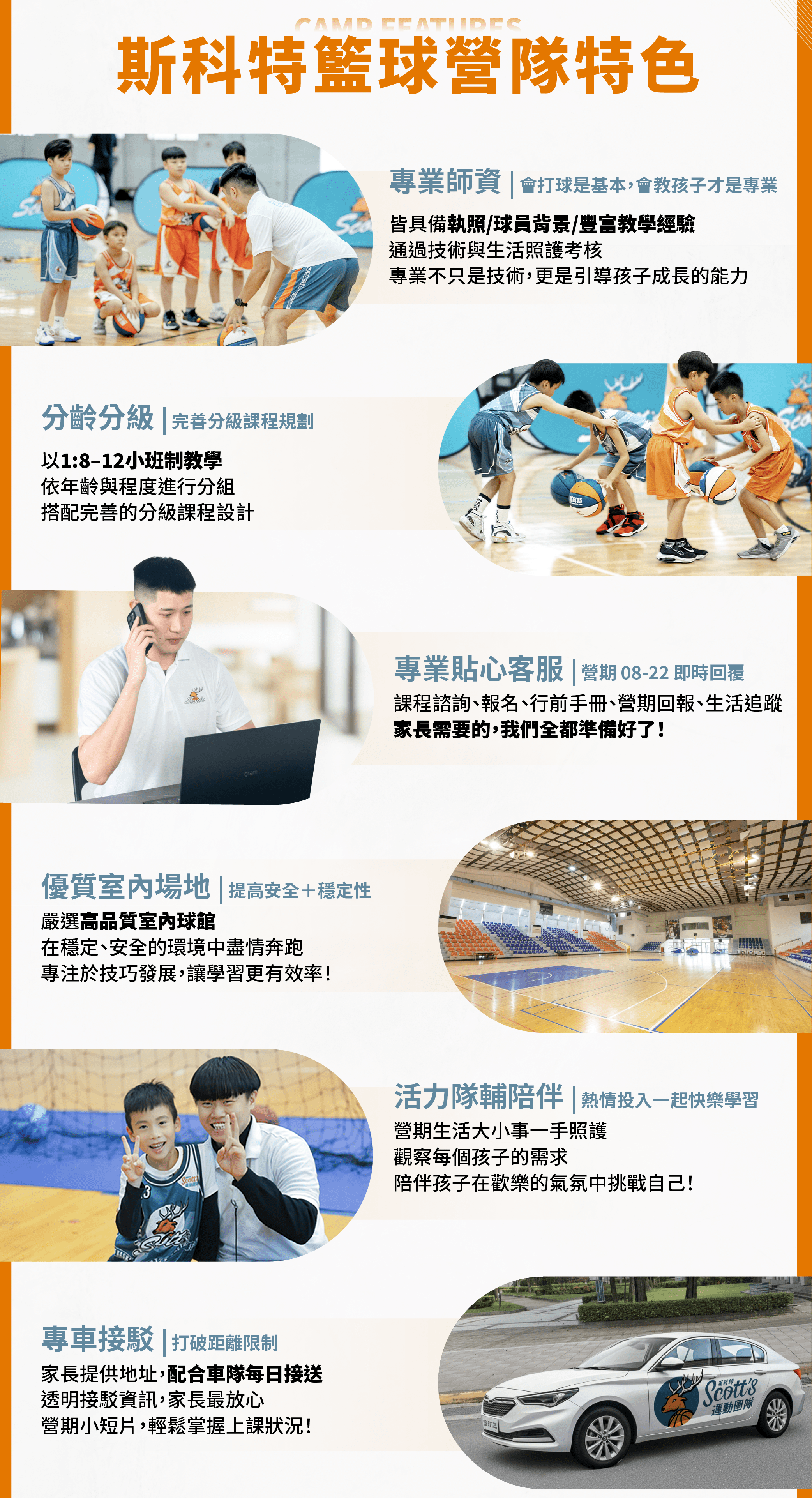 *本營隊需自備籃球,且球具需每日自行帶回,不可寄放於場館 • 師資專業,照護周全: 教練具備球員背景與執照,隊輔全程照顧,關懷鼓勵 • 小班分級,適性學習: 1:8 ~ 1:12 小班制,依程度分組,提供基礎到進階課程 • 課程系統,品質保證: 完整課綱研發與檢核,確保教學品質與成效 • 即時客服,安心放心: 營期內提供客服,建立照護回報機制,家長無憂