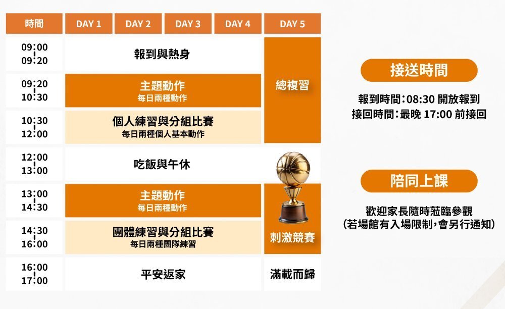 *本營隊需自備籃球,且球具需每日自行帶回,不可寄放於場館