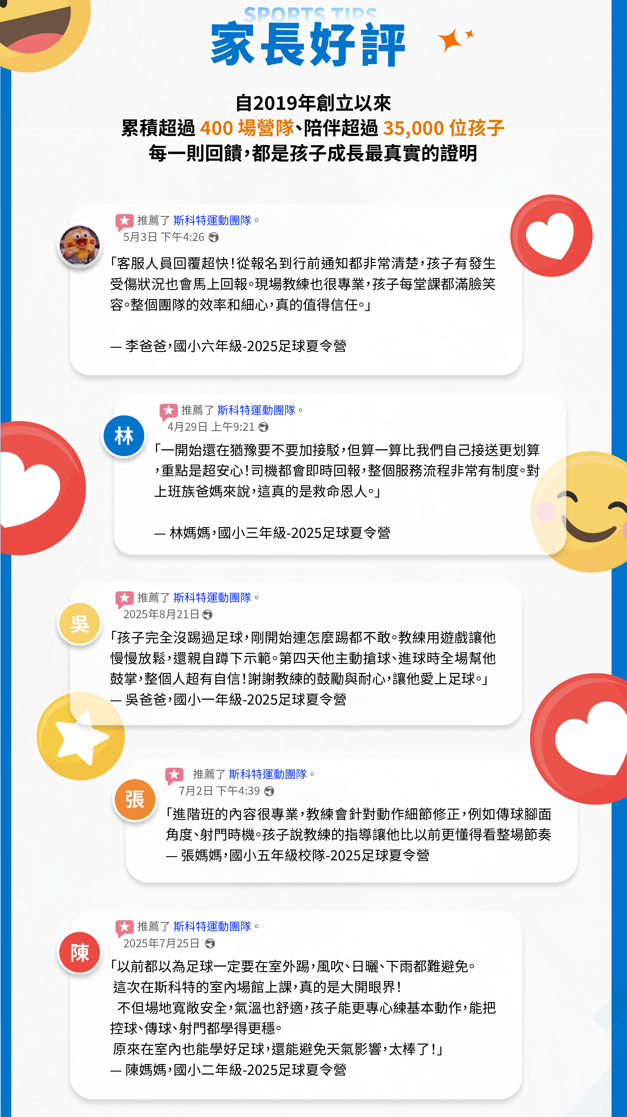 *學員可獲贈一顆低彈足球 • 師資專業,照護周全: 教練具備球員背景與執照,隊輔全程照顧,關懷鼓勵 • 小班分級,適性學習: 1:8 ~ 1:12 小班制,依程度分組,提供基礎到進階課程 • 課程系統,品質保證: 完整課綱研發與檢核,確保教學品質與成效 • 即時客服,安心放心: 營期內提供客服,建立照護回報機制,家長無憂