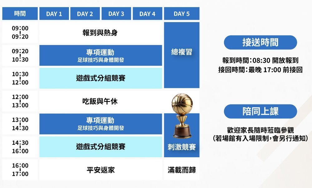 - 費用內含:師資費 / 課綱費用 / 場地費 / 餐食費 / 營隊小冊 / 五日營隊限定贈品(結業證書、獎牌)/ 安全保險 / 營隊贈品(足球)