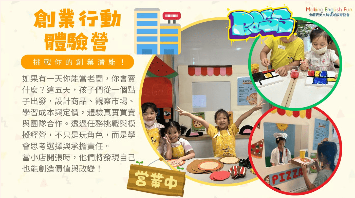 在老師陪伴下,孩子們動手創作屬於自己的商品,從構想到完成,每一步都充滿專注與驚喜。外師引導對話、激發創意,讓英語自然融入設計與分享過程。創業不只是賣東西,更是學會思考、嘗試與不怕失敗的態度。
